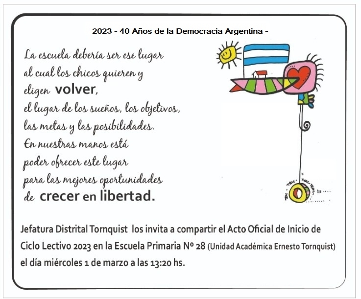 Acto oficial del inicio del Ciclo Lectivo 2023 en el distrito 27/02/2023 14:50:06 | 1259 LECTURAS | EDUCACION Tendrá lugar este miércoles en Tornquist.