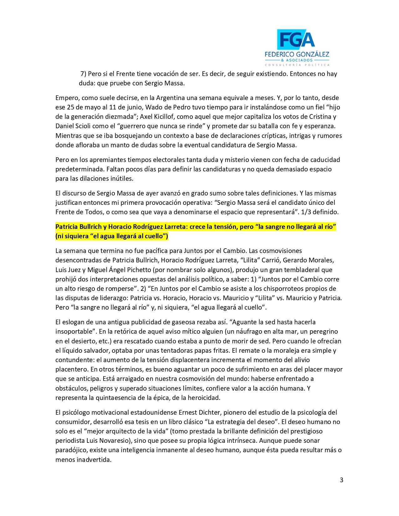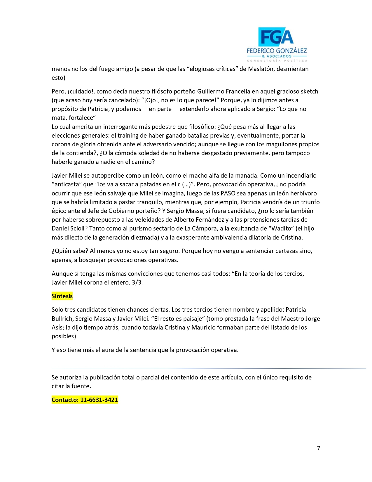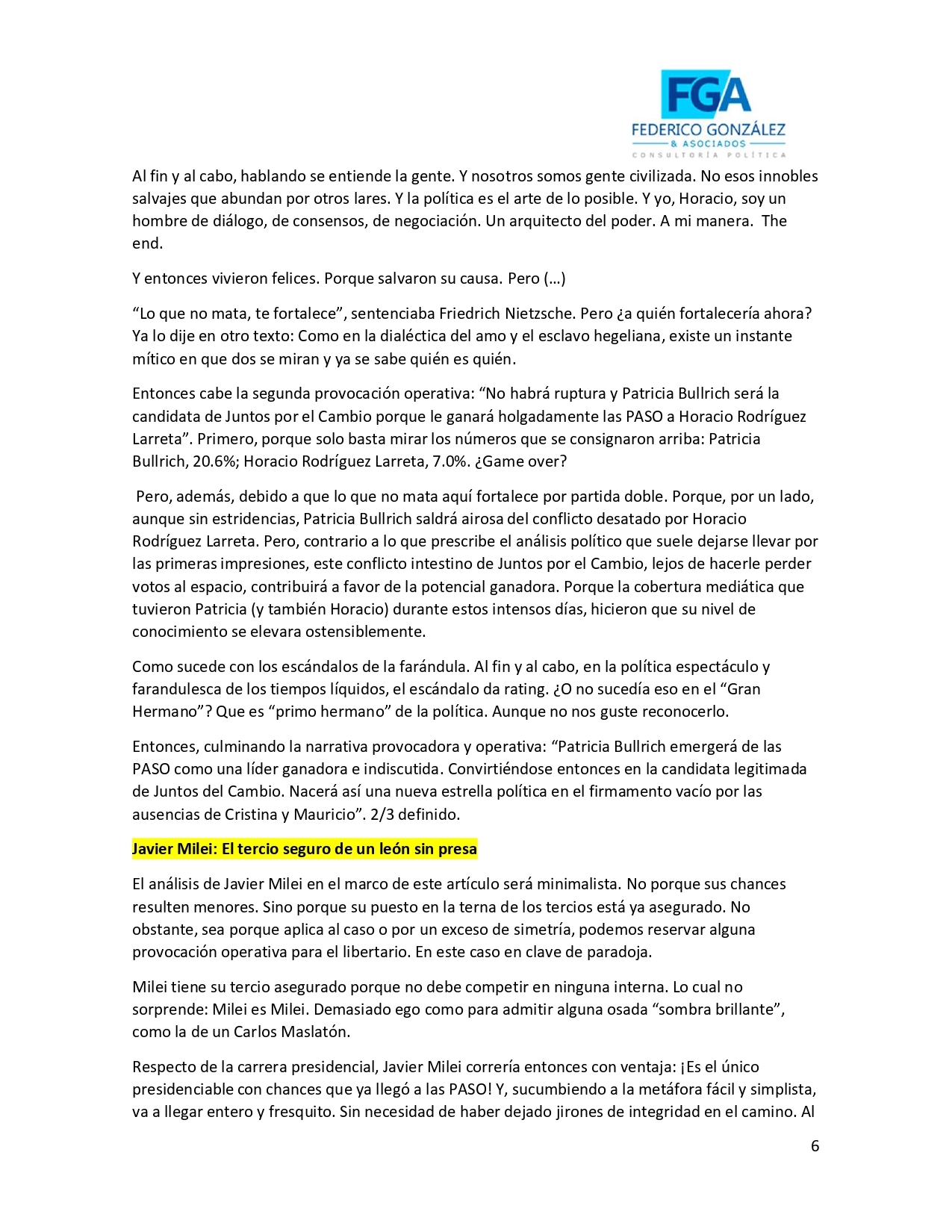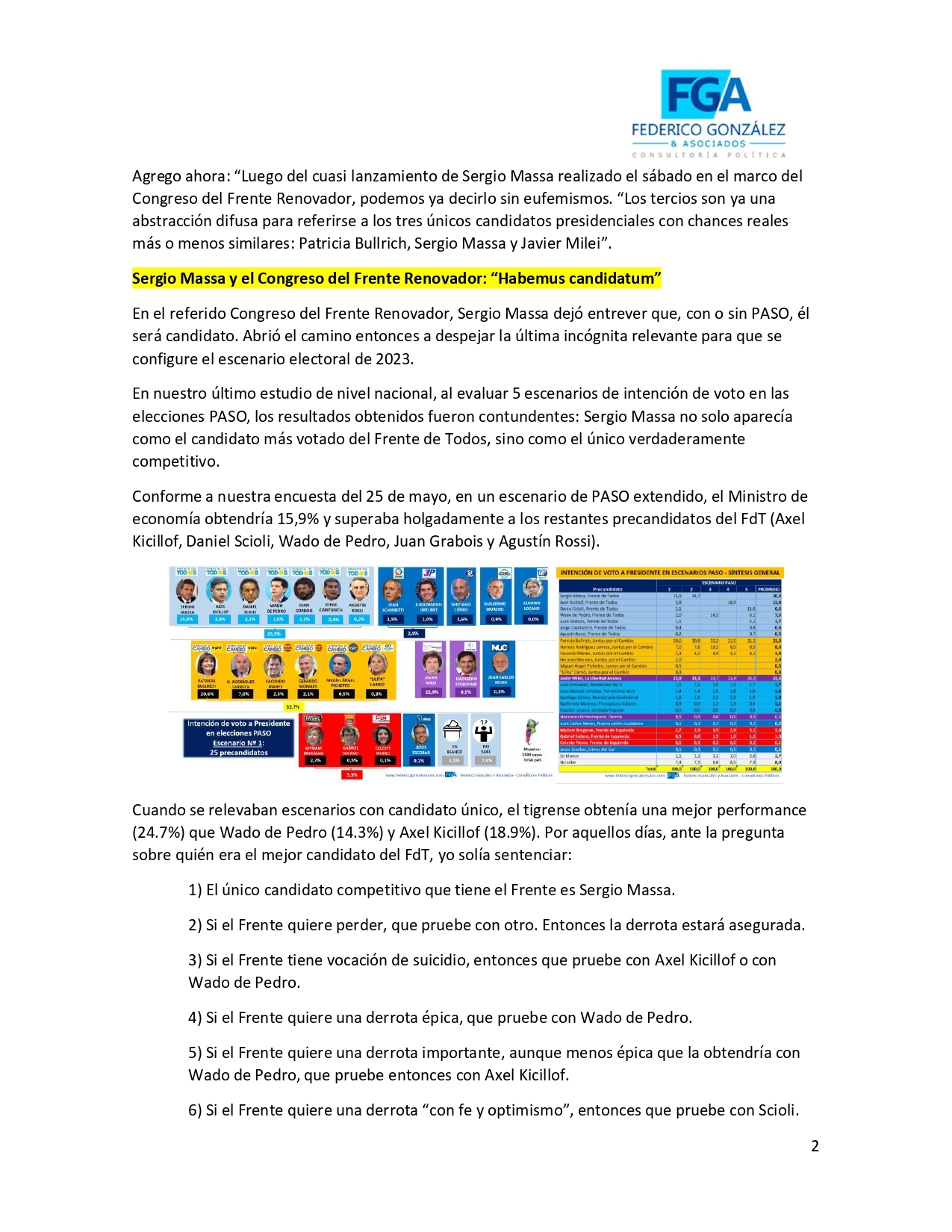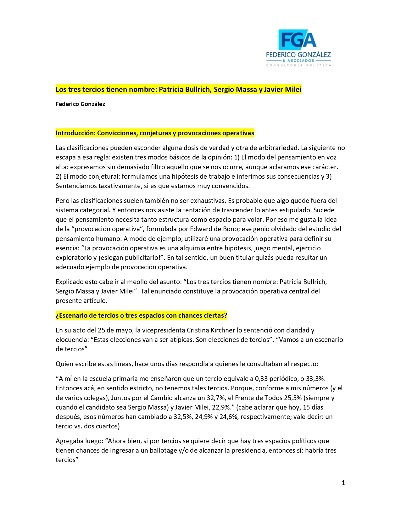 Encuesta: "Los tres tercios tienen nombre: Patricia Bullrich, Sergio Massa y Javier Milei 11/06/2023 12:38:10 | 982 LECTURAS | GENERALES Federico Gonzalez y Asociados.