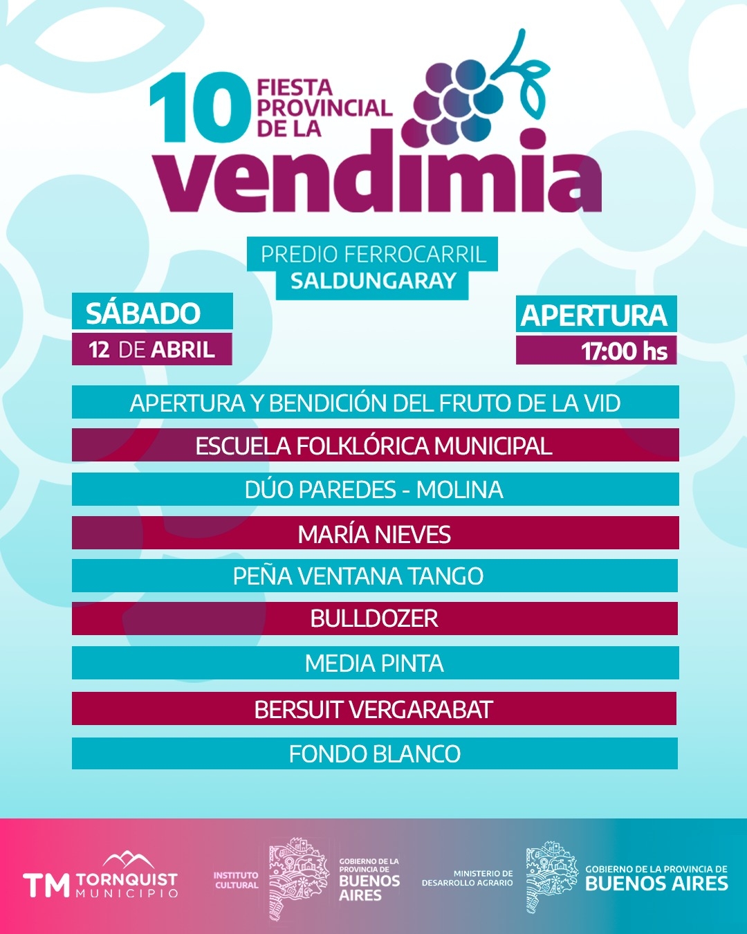 Saldungaray se prepara para recibir una nueva edición de su tradicional “Fiesta Provincial de la Vendimia”, que celebra la cultura vitivinícola, la música y la gastronomía local. En su 10ª edición, el evento se llevará a cabo los días 12 y 13 de abril en el predio del ferrocarril de la localidad.