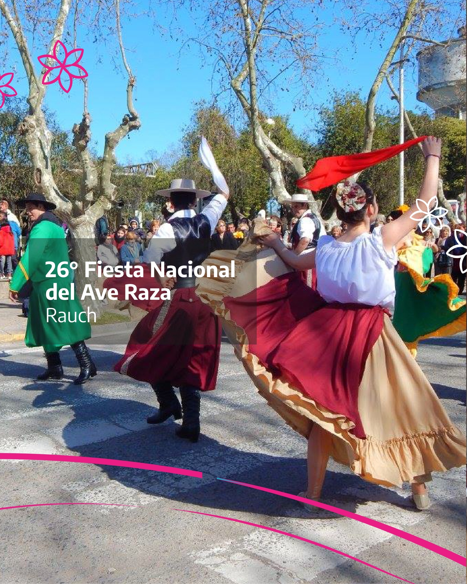 Descripción: El evento celebra la XXXII Exposición Nacional de Avicultura, la 10° Exposición de Gallinas Bantam y la 86° Exposición de Avicultura de la Sociedad Rural de Rauch, con puestos de artesanías y parrillas, la presentación de Luciano Pereyra, The La Planta y la Lapeband, y la elección de embajadoras culturales. Entrada: www.todopass.com.ar/inicio/. Organiza la Asociación Civil Fiesta Nacional del Ave Raza, la Municipalidad de Rauch y la Sociedad Rural de Rauch