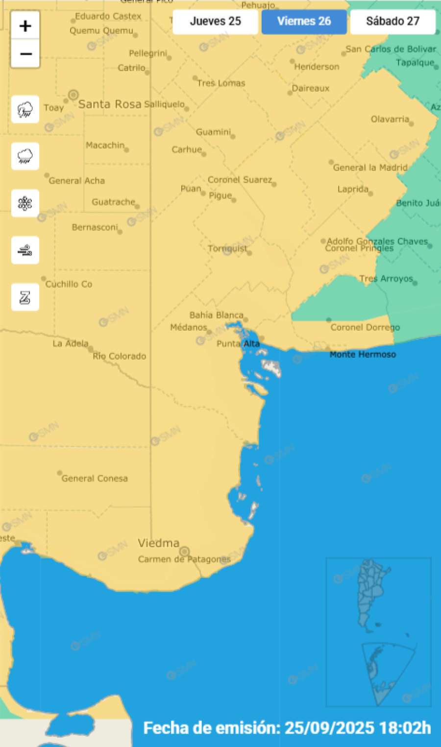 Además, hasta la tarde del viernes 26 se esperan vientos del sector norte con velocidades de 35 a 55 km/h y ráfagas que podrían superar los 80 km/h. A partir de la noche, se prevé un cambio de dirección al sur, con intensidades similares y ráfagas que, en algunos puntos, podrían alcanzar los 90 km/h.