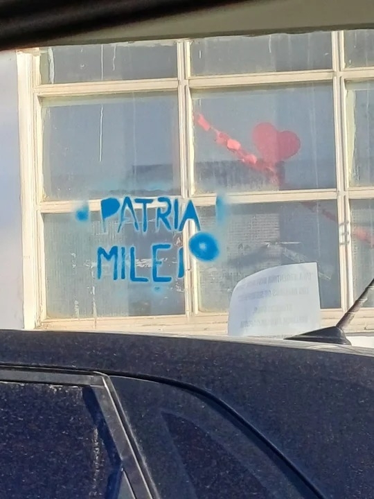 “Patria o Milei”, se lee en algunas de las pegatinas que están en las paredes y, paralelamente, un grupo de ciudadanos anunciaron un encuentro, hoy a las 16 en la Plaza Cívica “en defensa de la industria, los jubilados, los trabajadores, los estudiantes y las personas con discapacidad”.