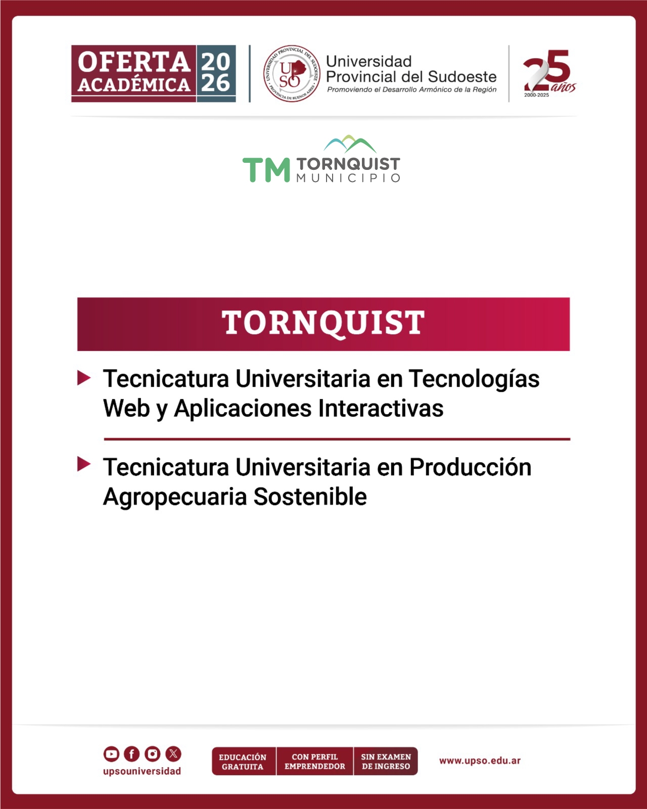 Tornquist Municipio, junto a la Universidad Provincial del Sudoeste (UPSO) informa que, a partir del año 2026, comenzarán a dictarse en Tornquist dos nuevas carreras de nivel universitario, ambas de 3 años de duración: