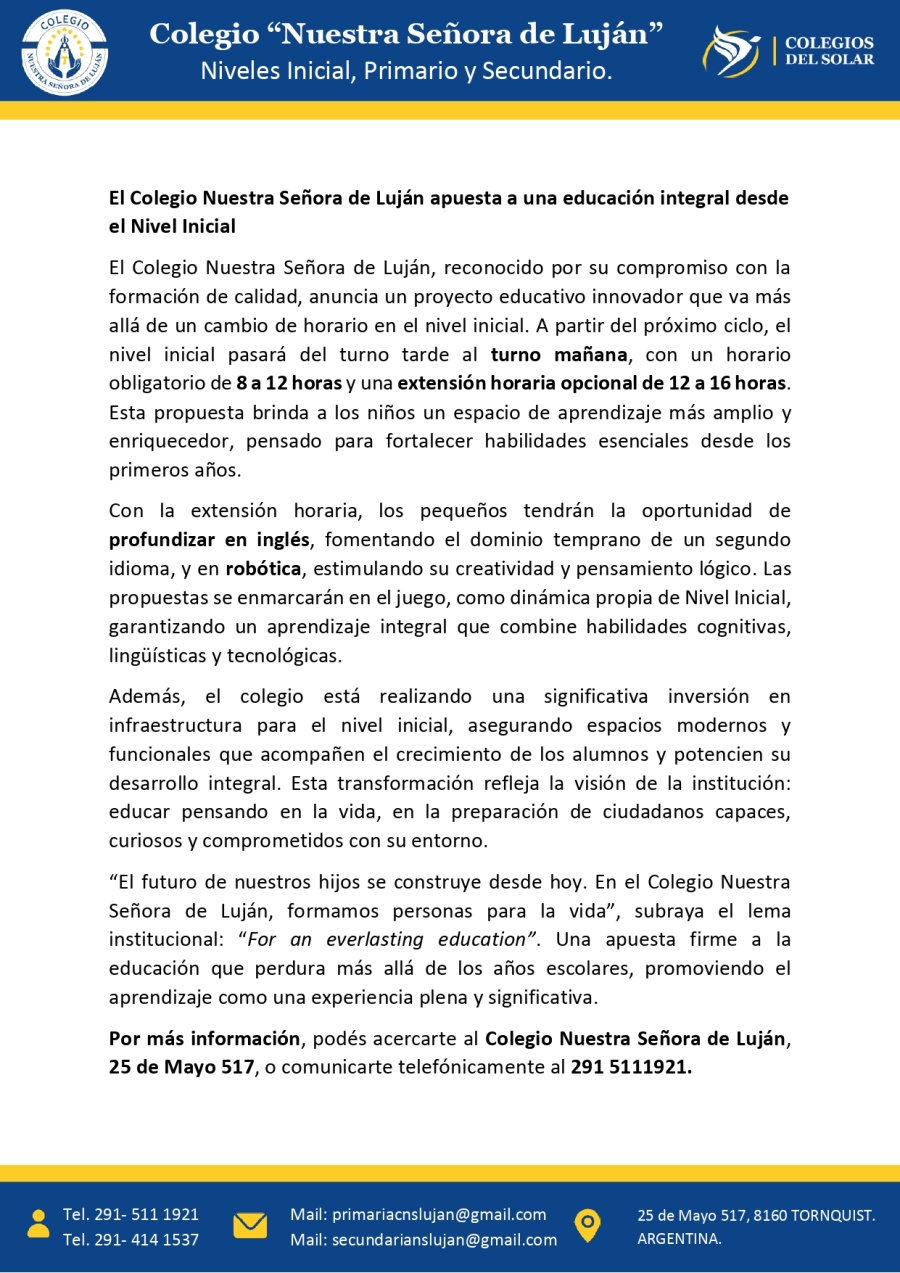 Desde 2026 el nivel inicial pasará al turno mañana, con extensión horaria opcional y propuestas innovadoras en inglés y robótica.