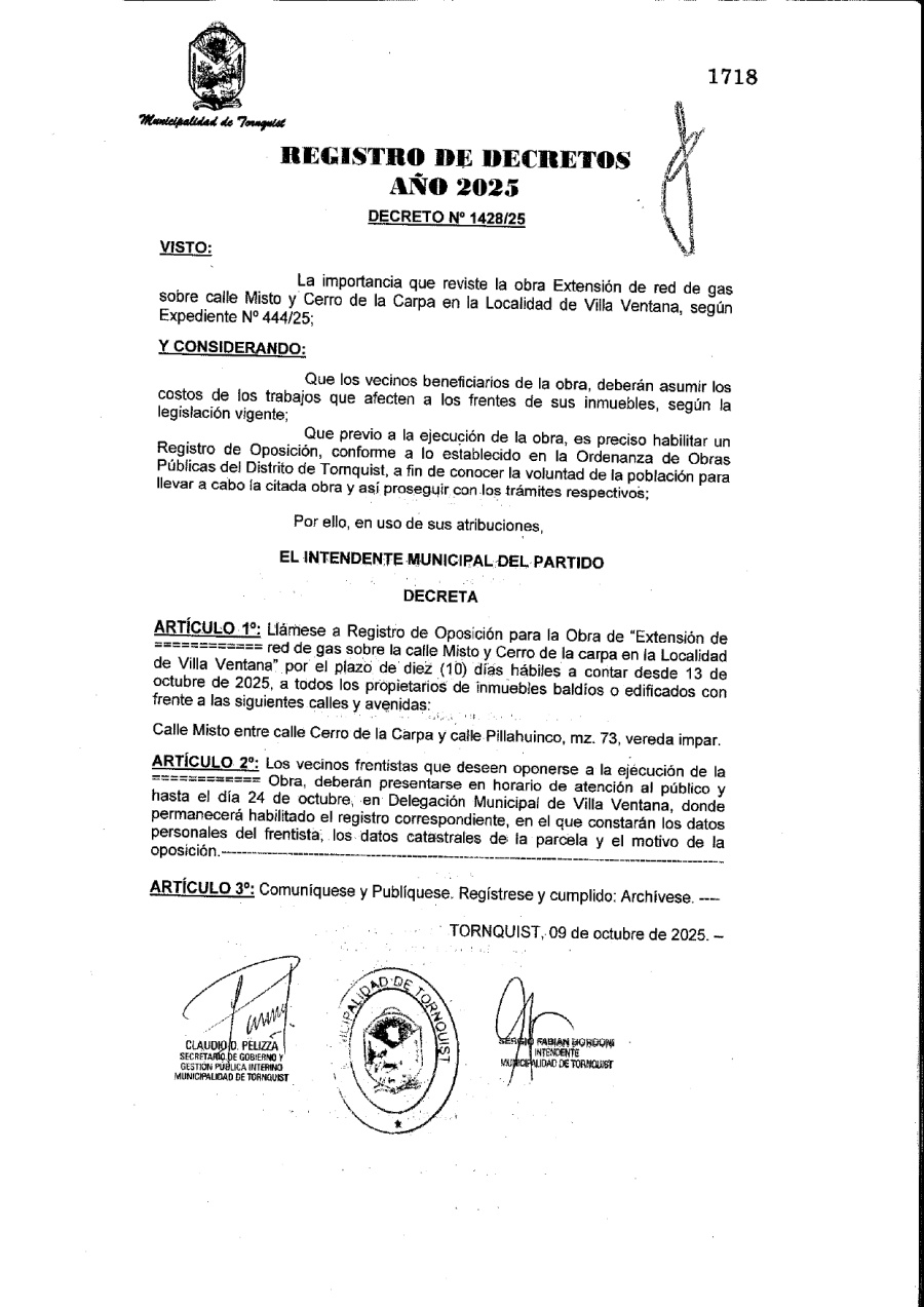 Tornquist Municipio informa que, por medio del Decreto 1428/25, desde el lunes 13 de octubre y por el plazo de diez días, se encontrará abierto el Registro de Oposición a la ‘Obra de Extensión de red de gas sobre la calle Misto y Cerro de la Carpa en la localidad de Villa Ventana’, a todos los propietarios de inmuebles baldíos o edificados con frente a las siguientes calles y avenidas: