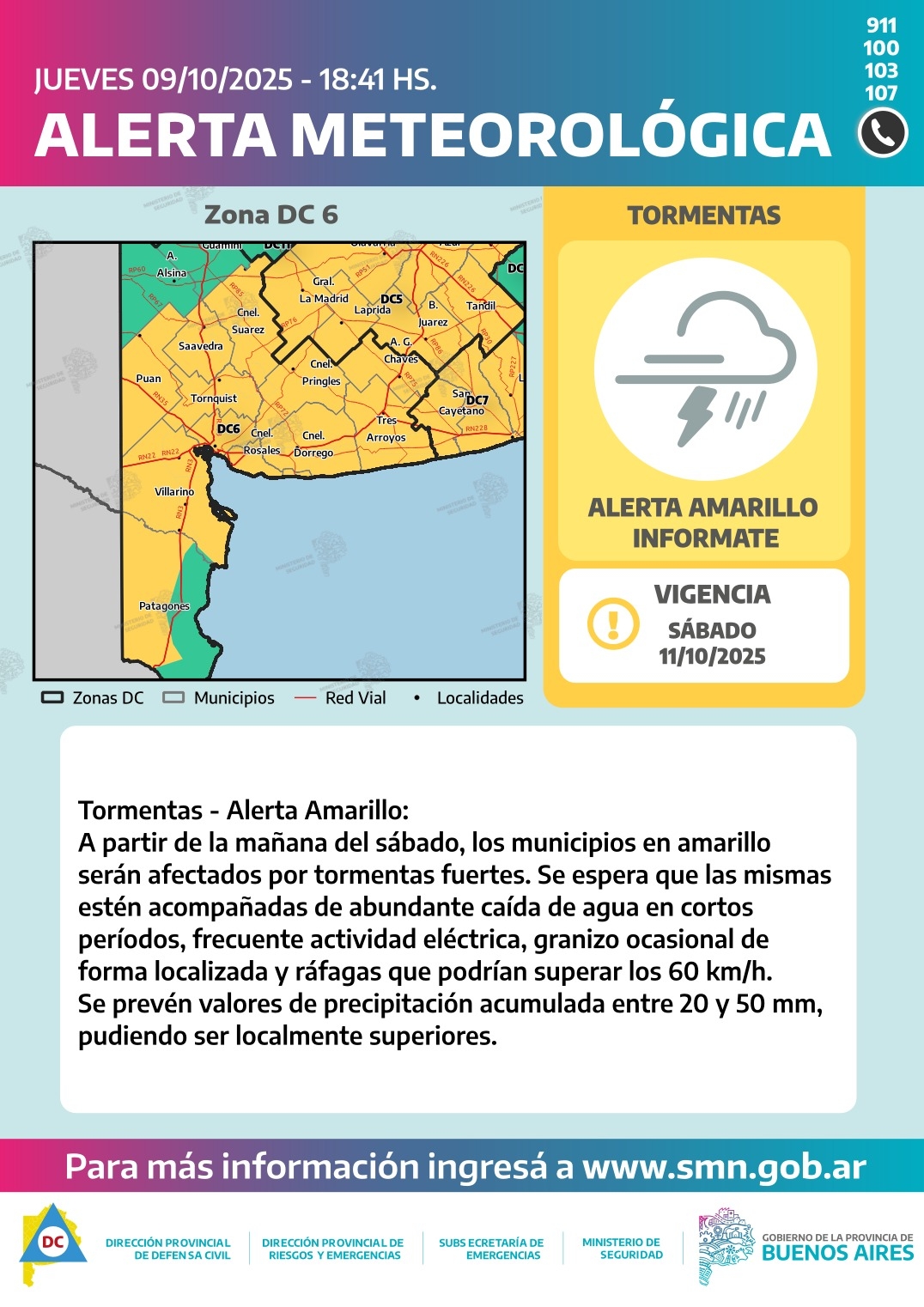 Las zonas afectadas serán: Bahía Blanca - Oeste de Patagones - Oeste de Villarino - Puan - Zona baja de Coronel Pringles - Zona baja de Coronel Suárez - Zona baja de Saavedra - Zona baja de Tornquist