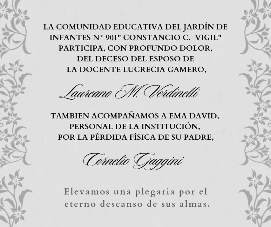 Participación por fallecimiento 22/10/2025 18:46:46 | 1719 LECTURAS | FALLECIMIENTOS Comunidad educativa del Jardín de Infantes N°901 "Constancio C. Vigil".