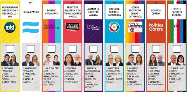 El oficialismo del gobernador Raúl Jalil apuntala para la renovación a Fernando Monguillot, Claudia Palladino y Alberto Natella. Mientras que La Libertad Avanza lleva como candidato a Adrián Brizuela, Myriam del Valle Juárez e Iván Rodolfo López.