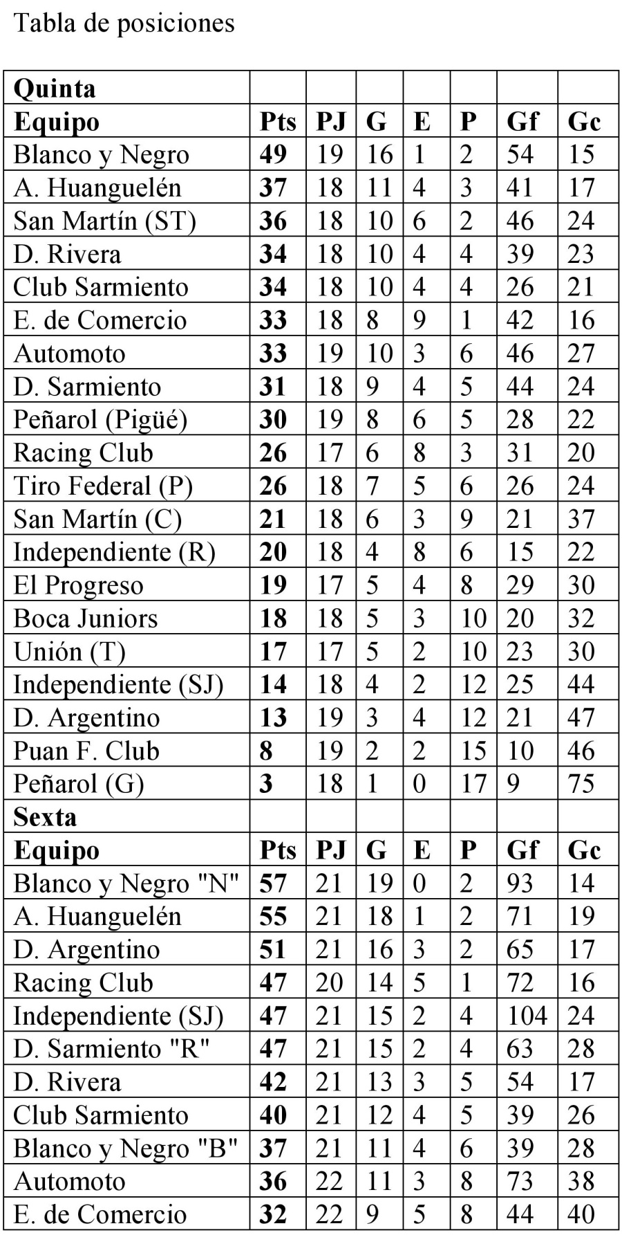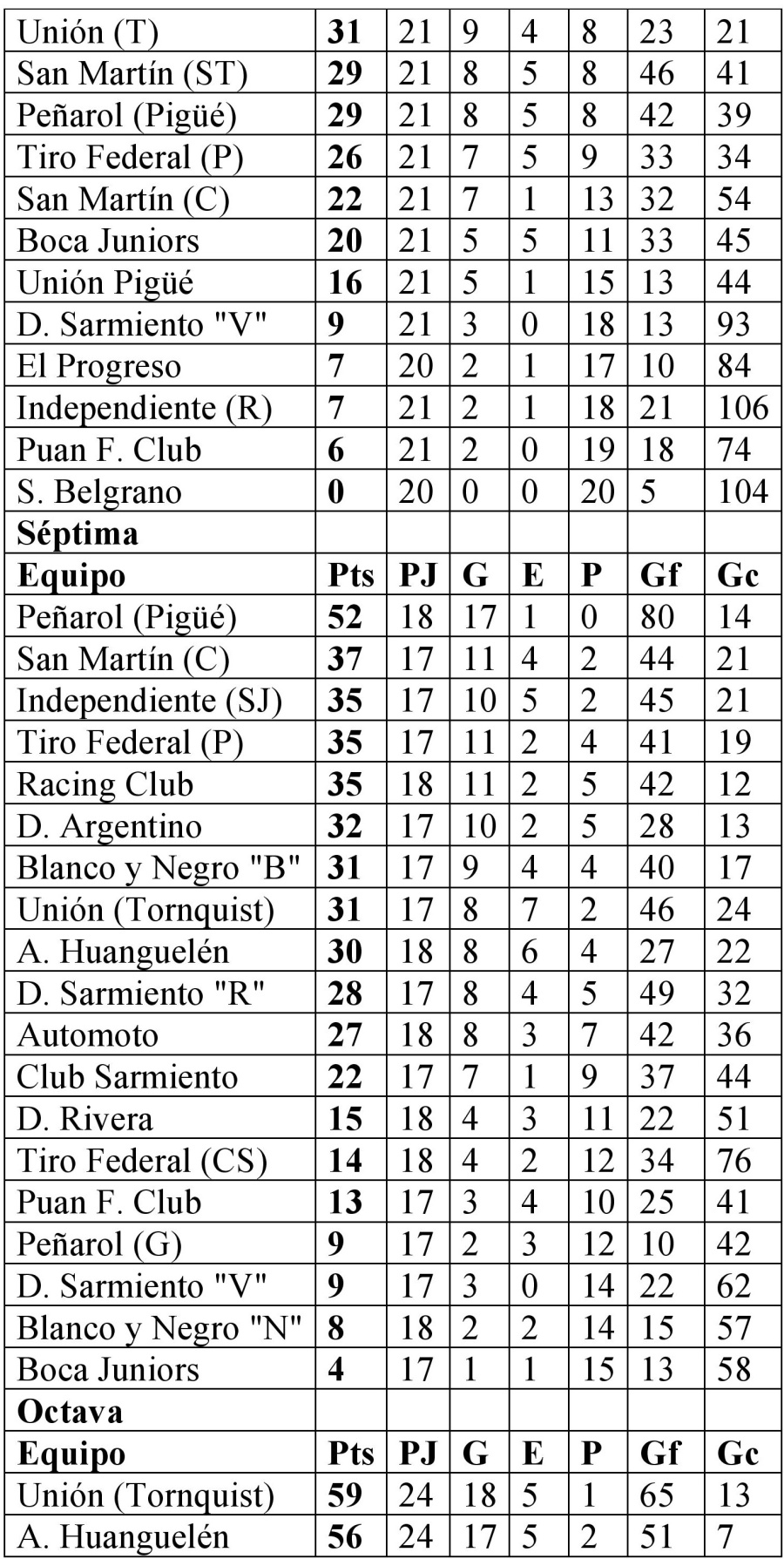Sexta. De la 5ª fecha: Atlético Huanguelén 2 vs. Deportivo Argentino 2. De la 8ª fecha: Deportivo Sarmiento “Verde” 0 vs. Tiro Federal de Puan 3. De la 14ª fecha: Blanco y Negro “Blanco” 4 vs. Independiente de Rivera 1 y Sportivo Belgrano de Espartillar 1 vs. Blanco y Negro “Negro” 2. De la 24ª fecha: Deportivo Rivera 6 vs. San Martín de Carhué 0. Adelanto de la 25ª fecha: Automoto 3 vs. Empleados de Comercio 3.