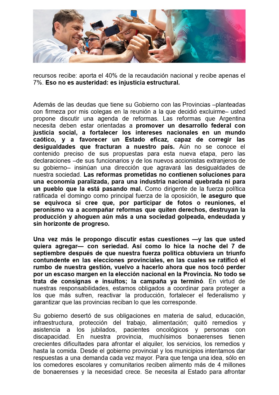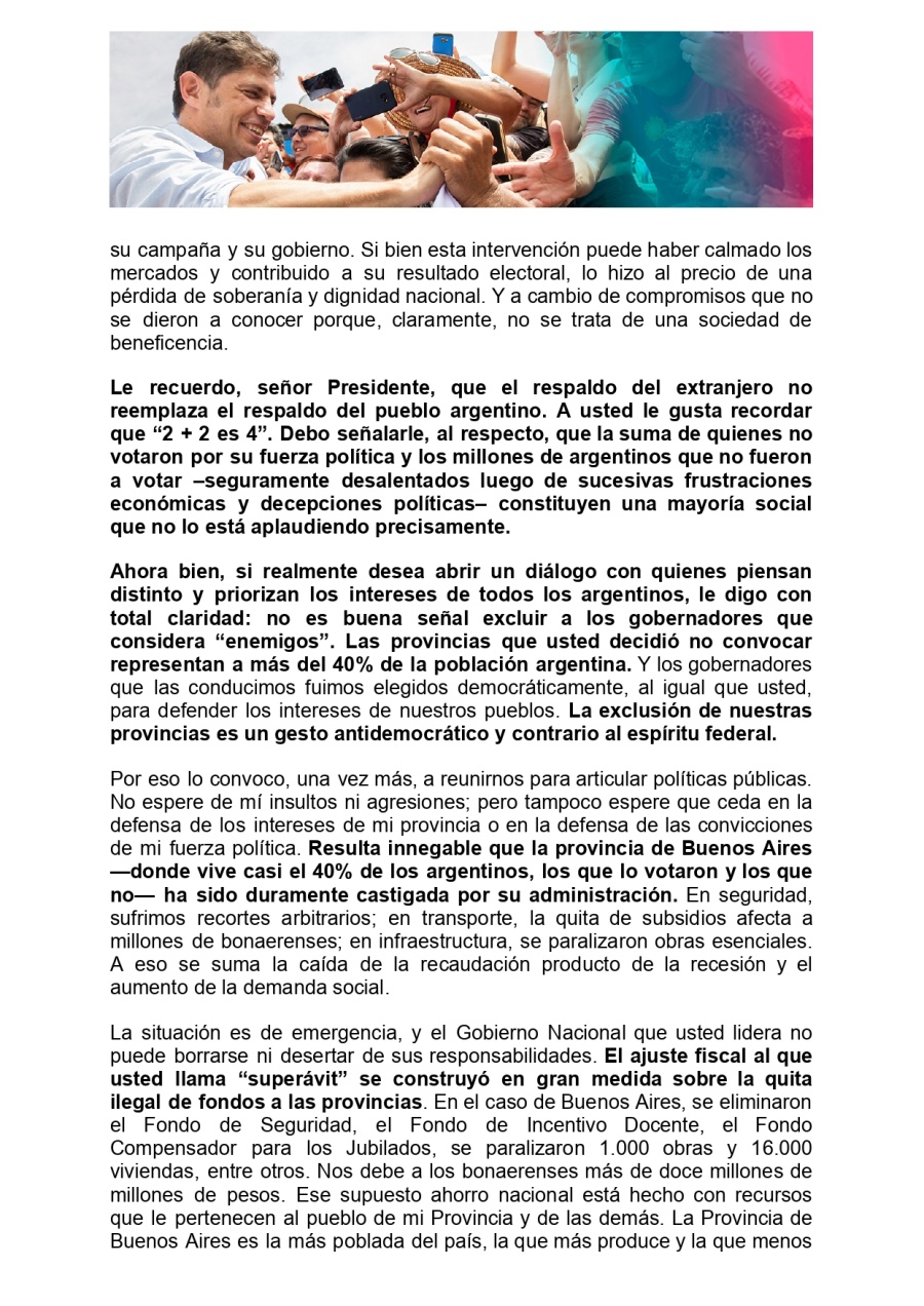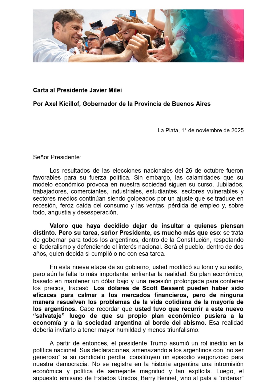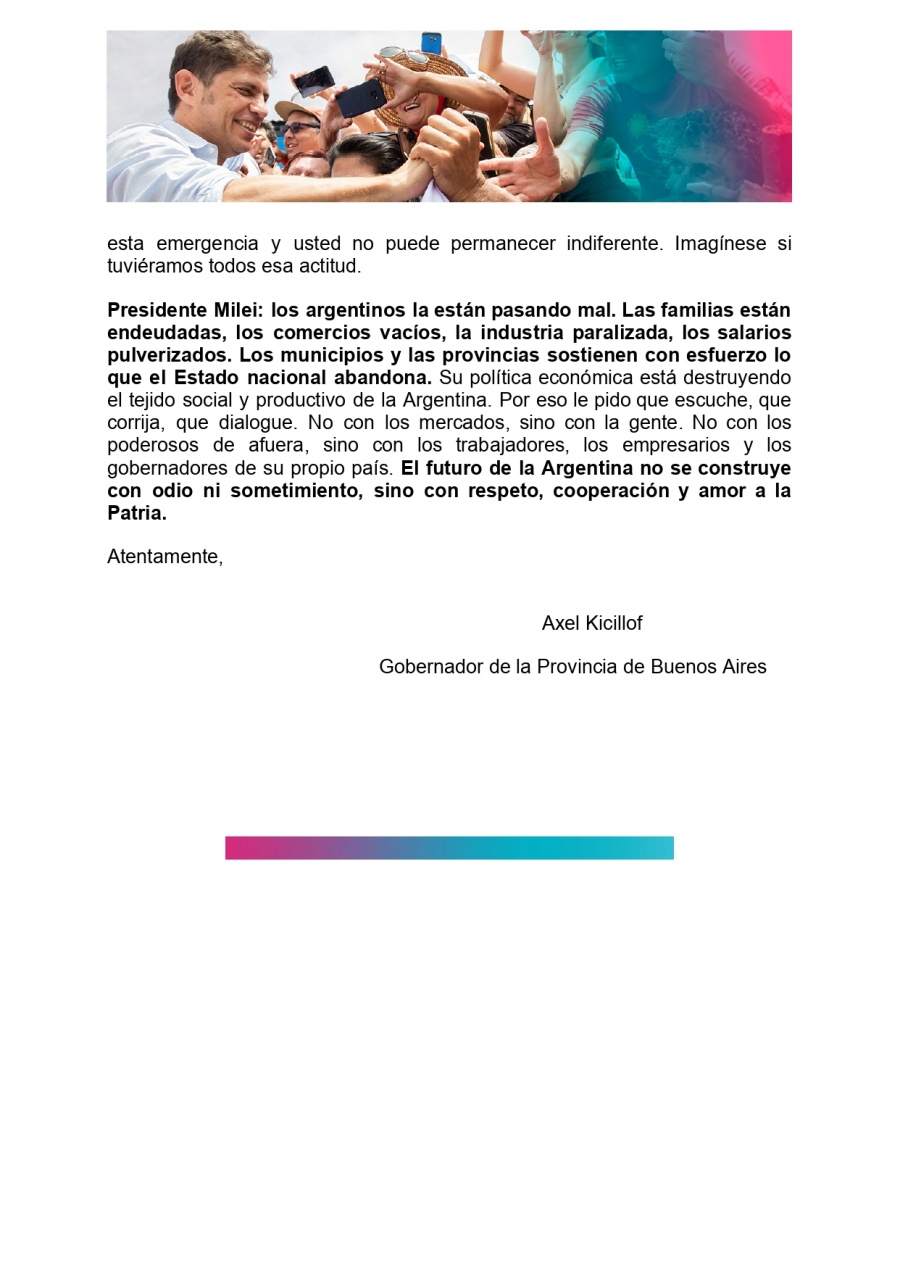 Kicillof envió una carta a Milei y le pidió “escuchar, corregir y dialogar”