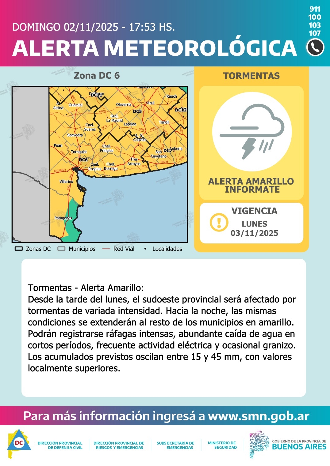 El Servicio Meteorológico Nacional emitió un alerta amarilla por tormentas para mañana a la tarde y la noche, extendièndose`al martes 4.