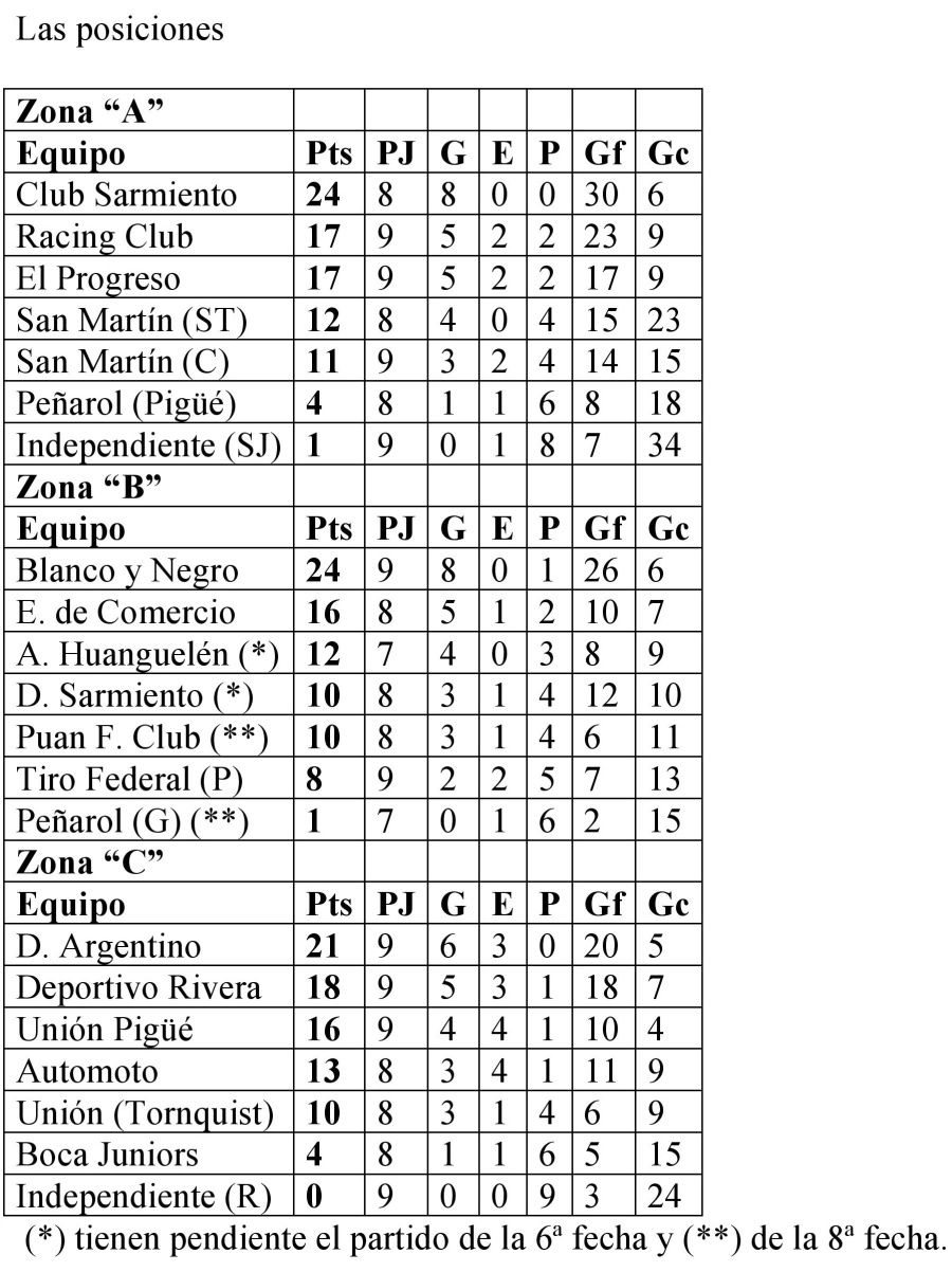 Club Sarmiento tuvo fecha libre y eso permitió que Racing Club y El Progreso (ganaron sus compromisos) se acerquen, pero el de Pigüé tiene una clara ventaja, incluso con un partido menos respecto de sus inmediatos perseguidores.