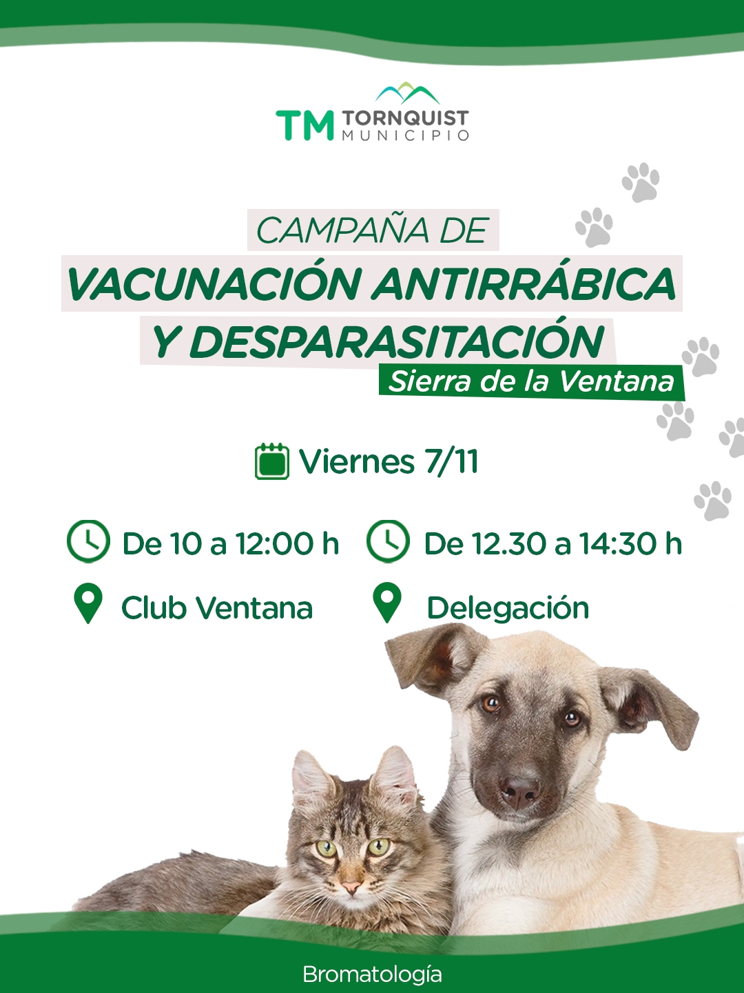 La Subsecretaría de Bromatología y Zoonosis continuará con su campaña de vacunación antirrábica y desparasitación gratuita para caninos y felinos en Sierra de la Ventana.