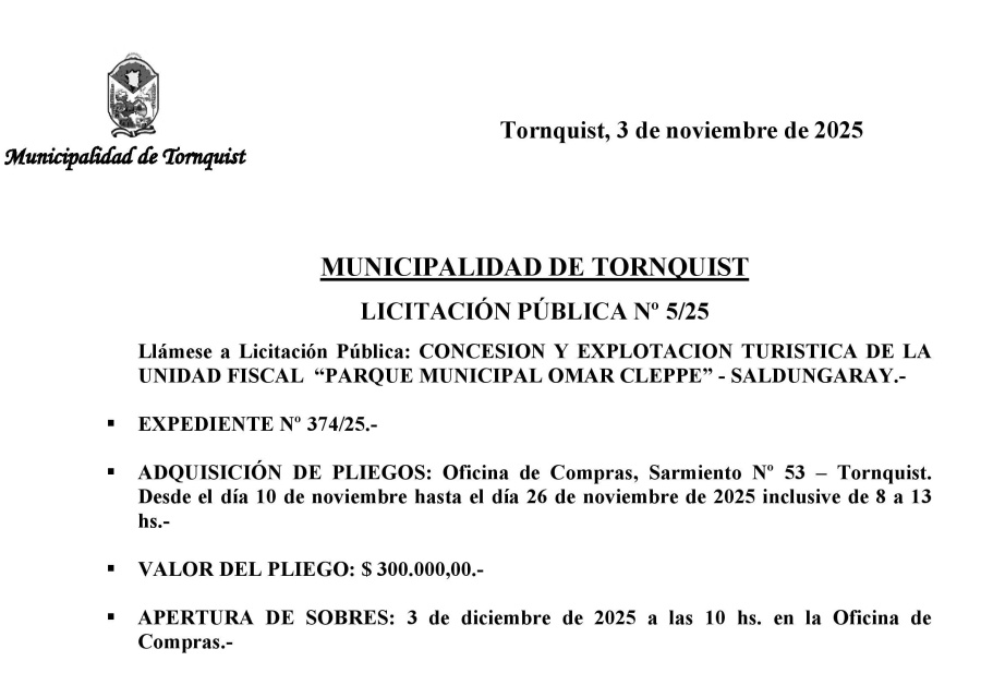 Llamado a licitación pública N°5/25 HOY 10:11:59 | 237 LECTURAS | MUNICIPALES Informa Tornquist Municipio.