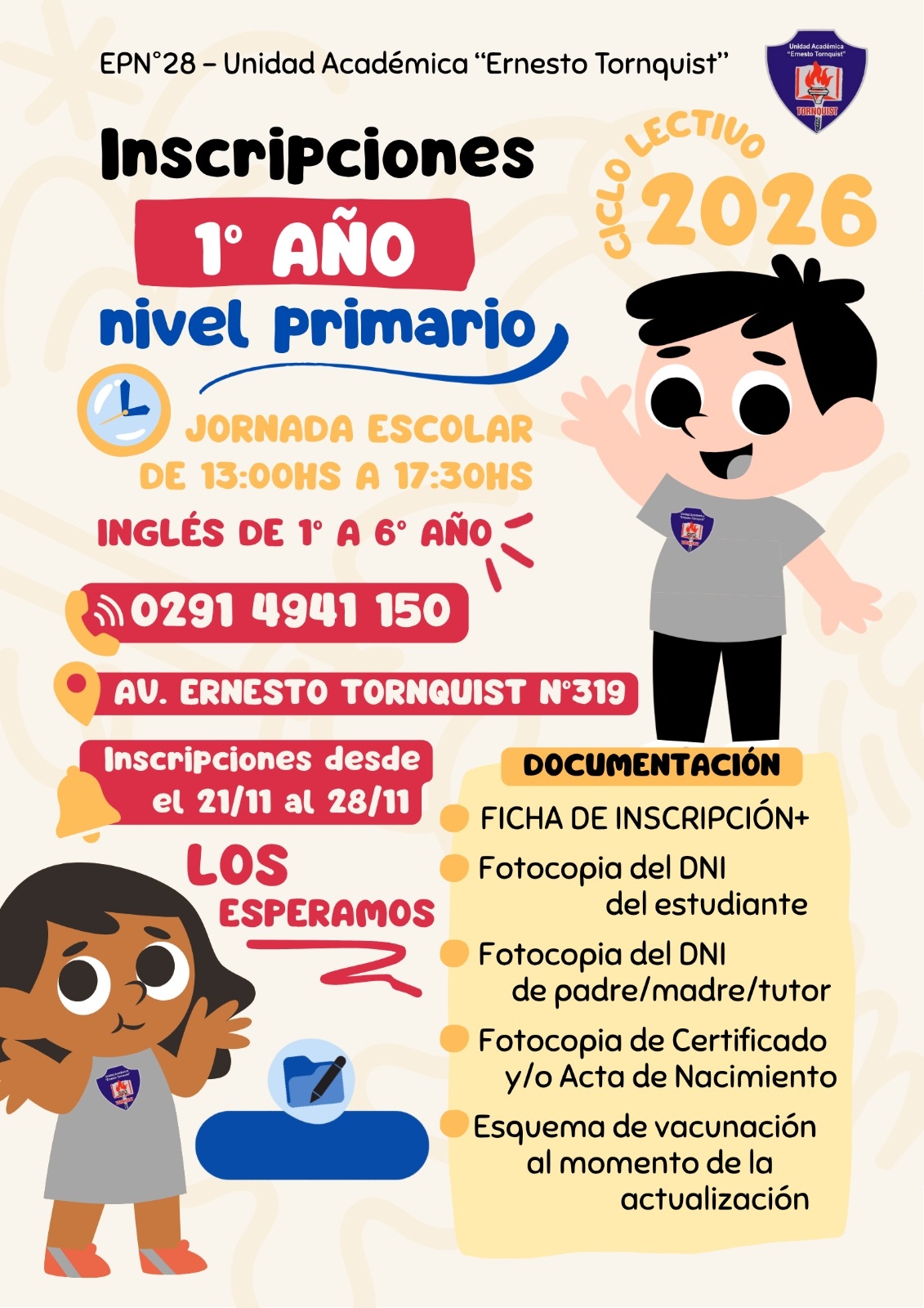 La escuela inicia el ciclo lectivo 2026 con jornada extendida, inglés desde 1° a 6° y un período de inscripción del 21 al 28 de noviembre