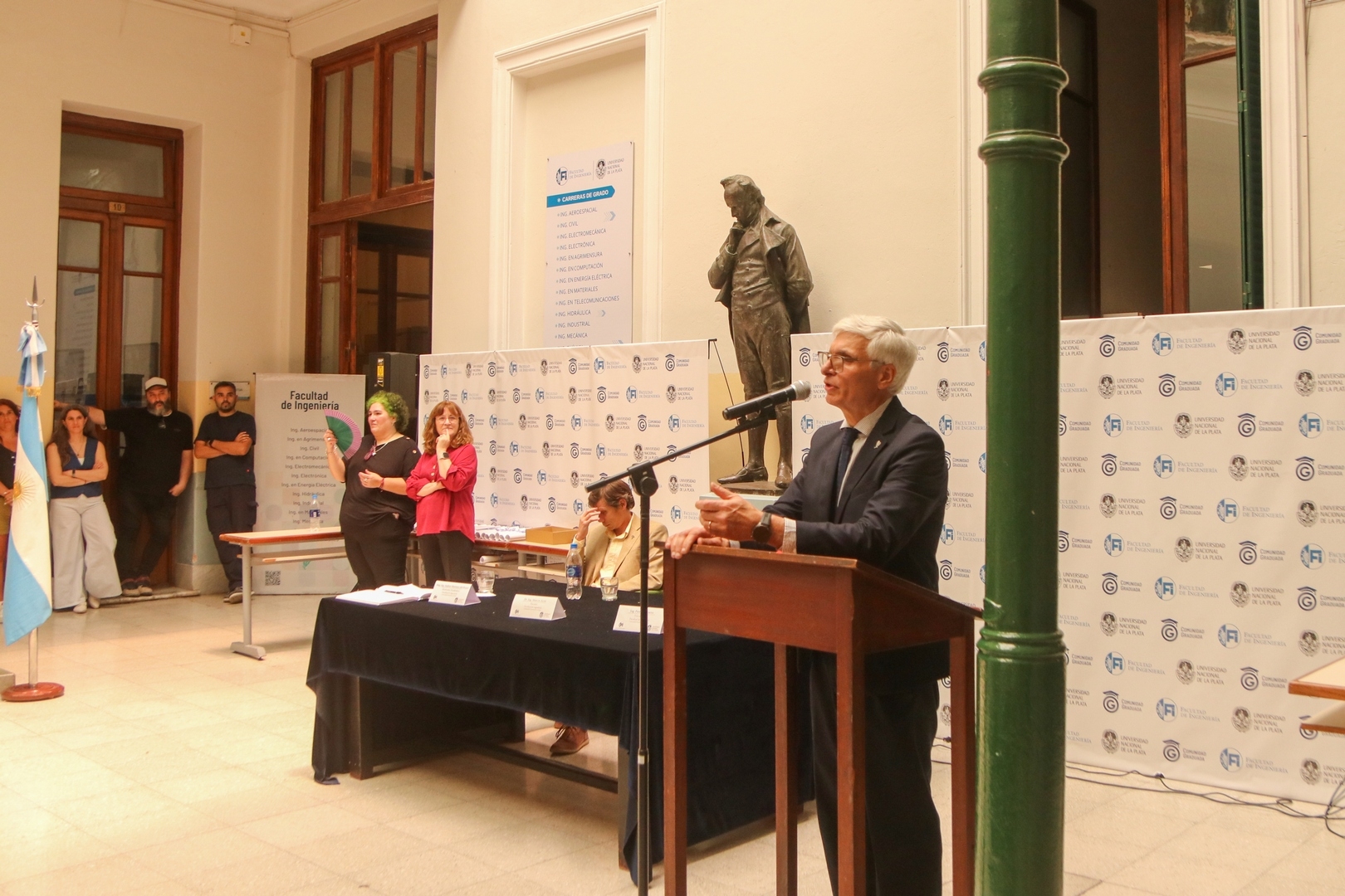 El decano destacó la importancia de la exigencia y la dedicación en la educación, y cómo esto ha llevado a un aumento significativo en el número de graduados en la Facultad en comparación con hace 20 años. Para Actis, mantener la cursada de Matemática para Ingeniería (Mate Pi), y con aprobación obligatoria para cursar primer año, “ha permitido que hoy tengamos que hacer cuatro actos académicos al año”, por la cantidad creciente de egresados.