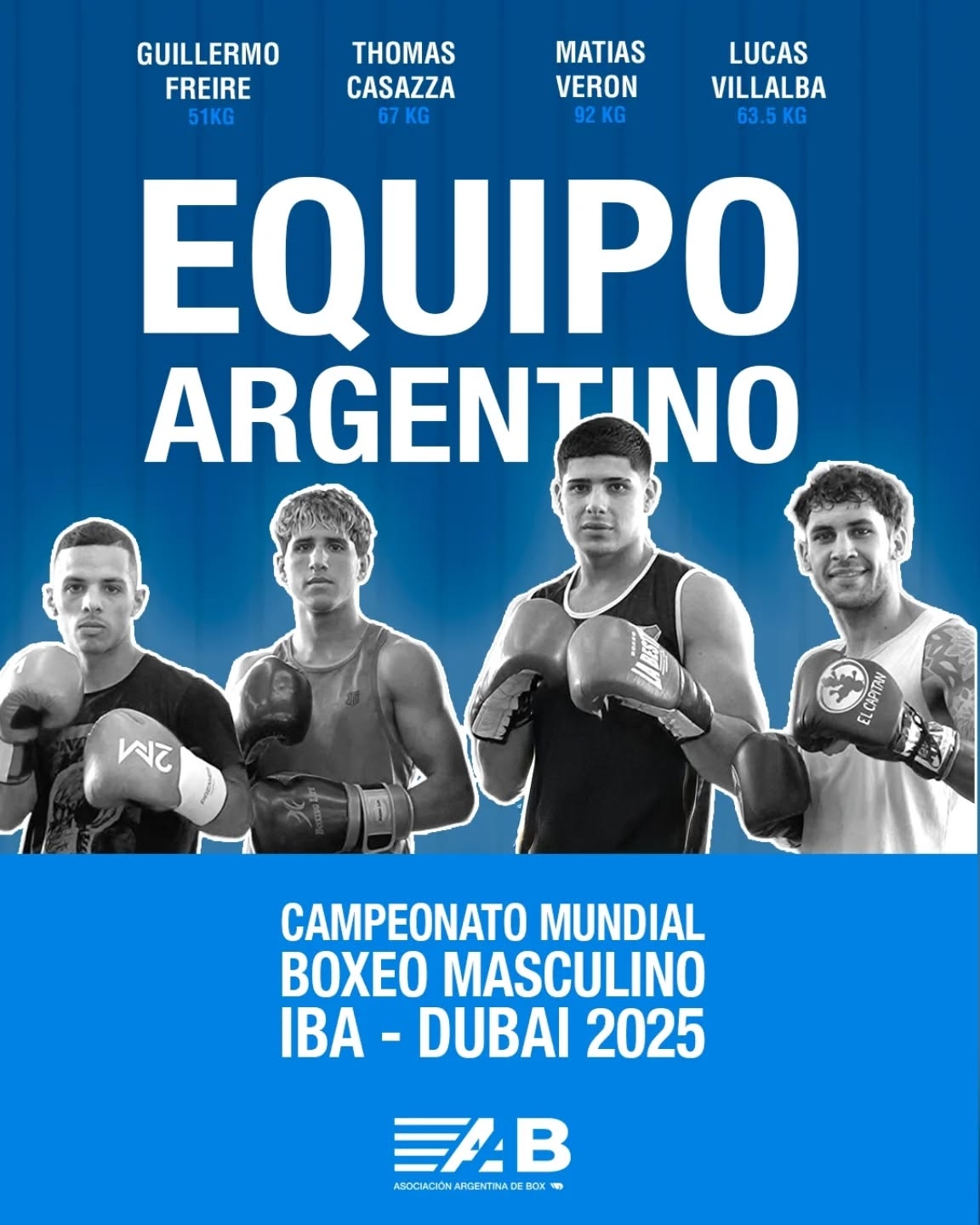 Buenos Aires, 30 noviembre (NA) — Los pugilistas argentinos Guillermo Freire (51 kilos), Thomas Casazza (67 kilos), Matías Verón (92 kilos) y Lucas Villalba (63,5 kilos) competirán en el Campeonato Mundial de Boxeo Amateur organizado por la International Boxing Association (IBA) que se llevará a cabo en Dubai, Emiratos Árabes Unidos.