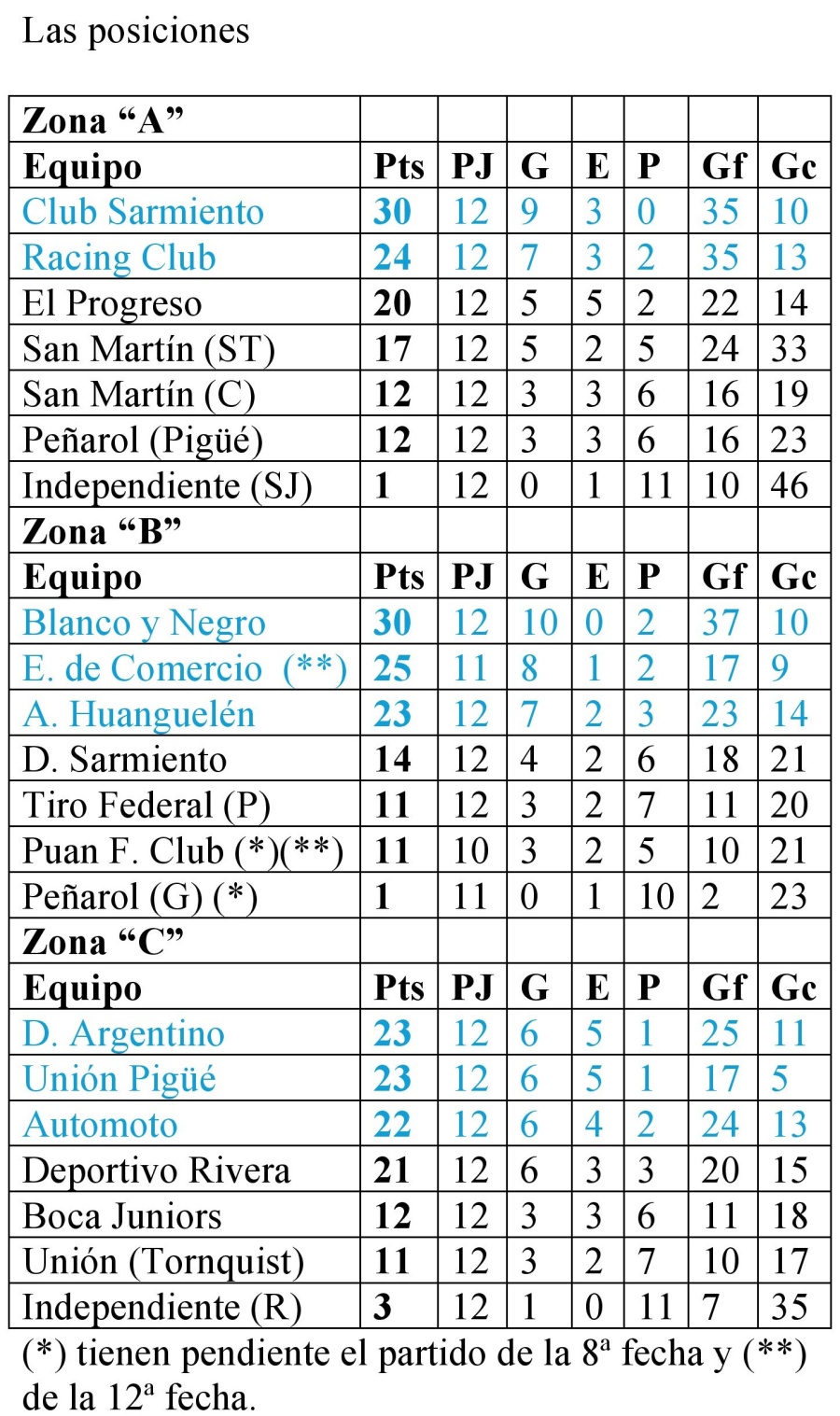 Los que tenían el boleto de antemano son Club Sarmiento, Racing Club (1° y 2° de la zona “A”), Blanco y Negro, Empleados de Comercio (1° y 2° de la zona “B”), Deportivo Argentino y Unión Pigüé (1° y 2° de la zona “C”).