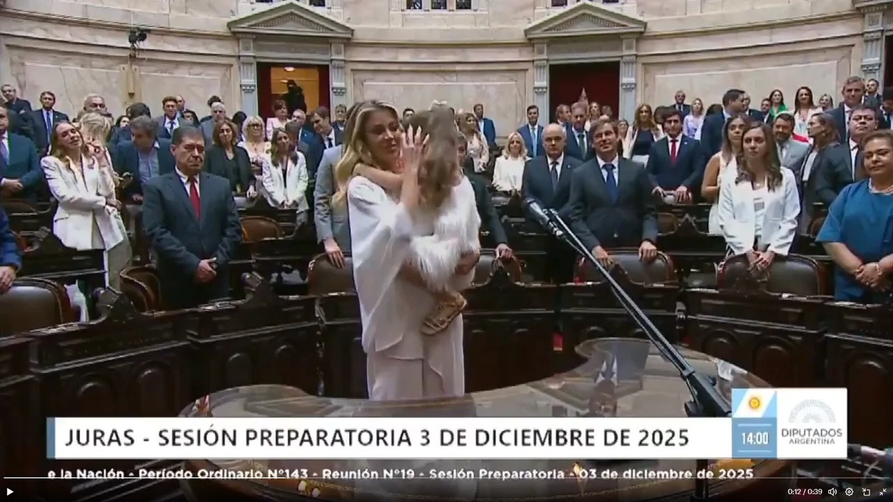 Al promediar la sesión preparatoria en la Cámara baja, la ex vedette, proveniente del mundo de las plumas y del teatro de revista, pasó al frente para jurar vestida de punta en blanco, como si fuera una novia entrando a la Iglesia, con su hija en brazos.