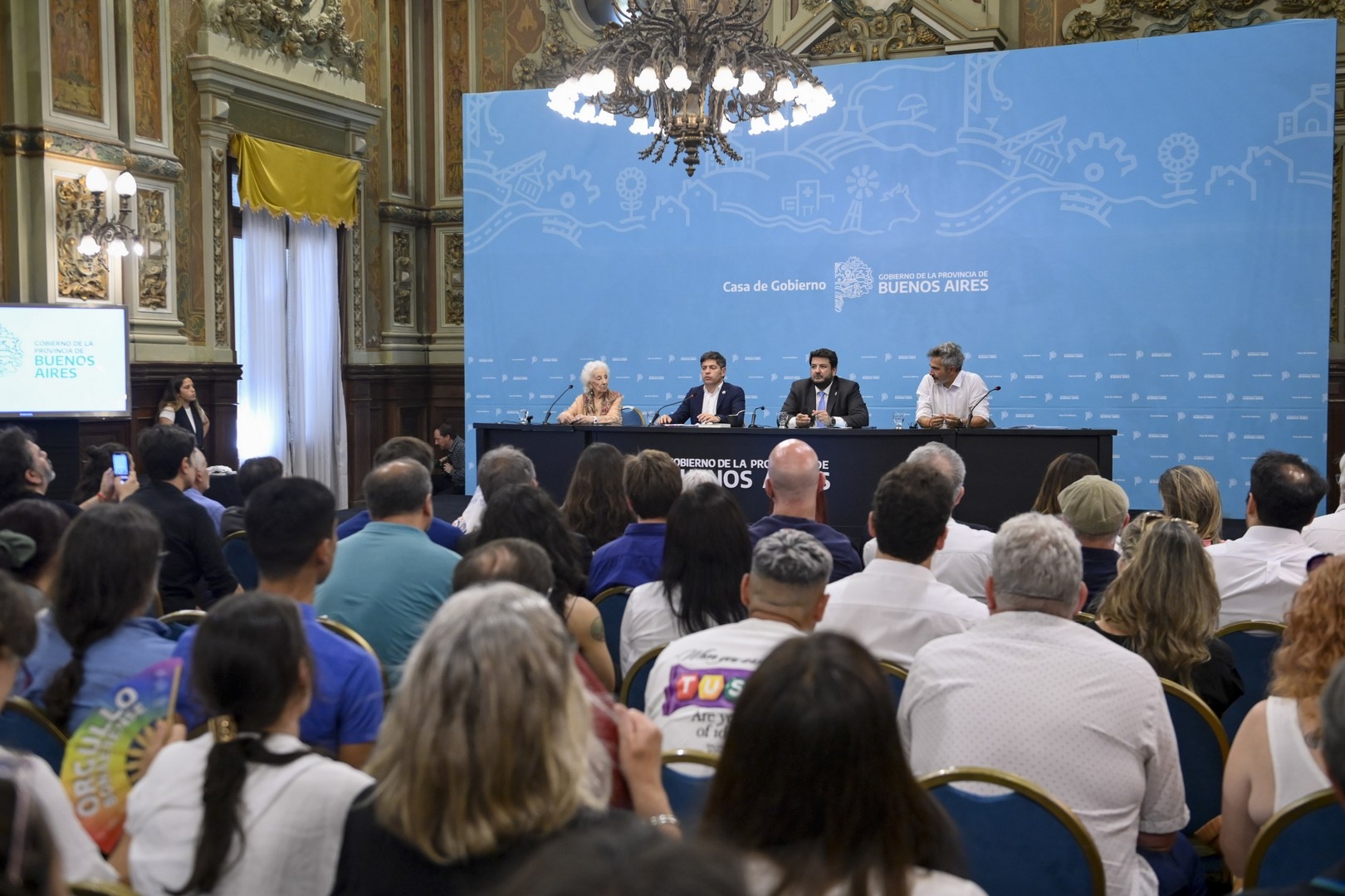 El gobernador de la provincia de Buenos Aires, Axel Kicillof, encabezó este miércoles un acto por el Día Internacional de los Derechos Humanos. Fue en el Salón Dorado de la Casa de Gobierno, junto al ministro de Justicia y Derechos Humanos, Juan Martín Mena; el subsecretario de Derechos Humanos, Matías Moreno; y la presidenta de Abuelas de Plaza de Mayo, Estela de Carlotto.