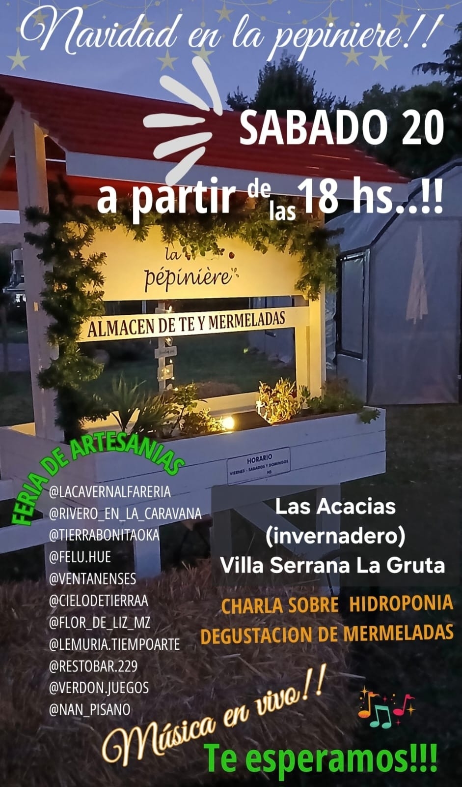 Alejandra Moreno desde "La Pepiniere", en Villa Serrana La Gruta (Acceso a la derecha/Invernadero), Las acacias 449 AQUI, invita a la celebración de Navidad el día sábado 20 de Diciembre desde la hora 18.