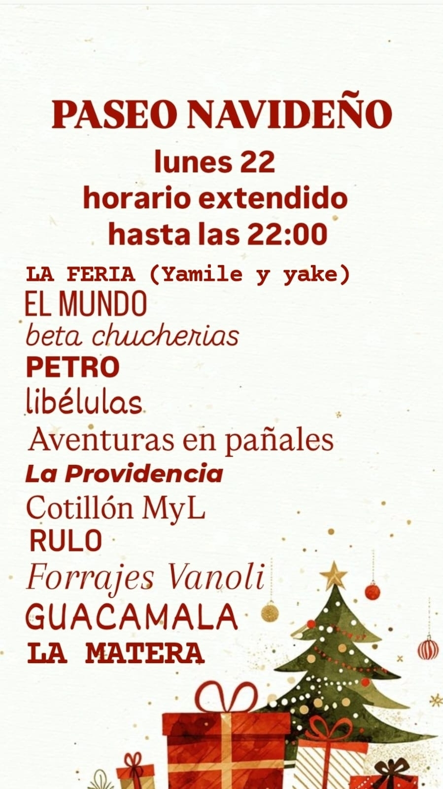Un grupo de comerciantes de la ciudad , se reunió y decidió extender el horario habitual de atención, para poder brindar a la clientela, la oportunidad de realizar las compras navideñas, sin apuro, sin estrés y que se pueda disfrutar del espíritu navideño sin presiones, con el tiempo extra que se necesita para que todo sea una buena elección, y poder personalizar cada regalo.