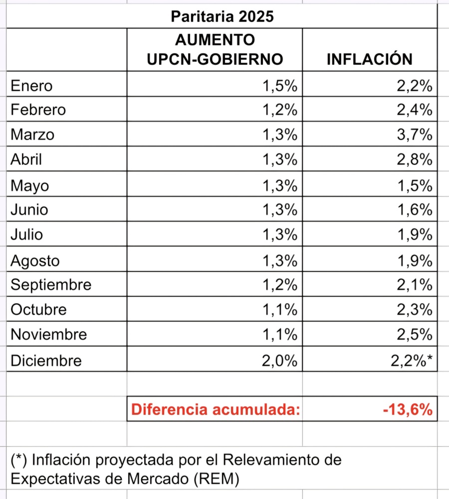 En esta línea, Aguiar apuntó: “Tienen que explicar a cambio de qué firman incrementos por debajo de la evolución de los precios, cuál es la contrapartida por permitir la demolición de los ingresos. A esta altura, en el Sector Público UPCN ya es socio de la motosierra. Este aumento vergonzoso se da en medio de una inflación en ascenso y anticipa un inicio de año altamente conflictivo”.