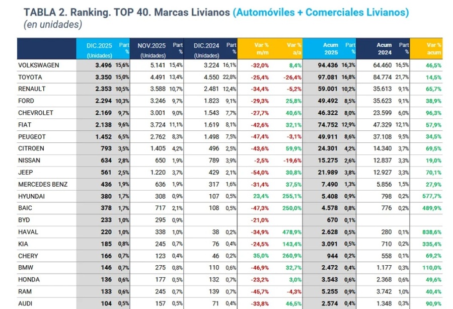 Entre las marcas más vendidas en autos livianos, se destacaron Volkswagen, Toyota y Renault en el podio.