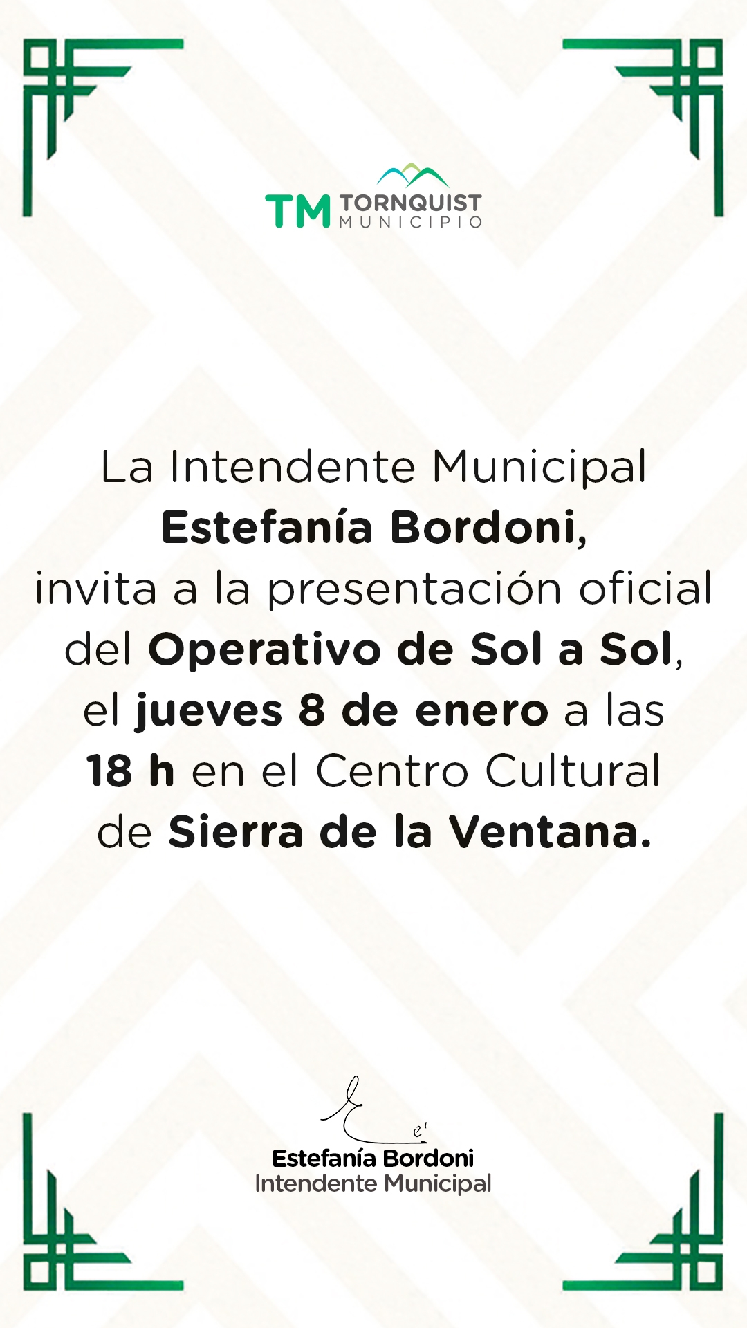 La Intendente Municipal, Estefanía Bordoni, invita a la comunidad a participar de la presentación oficial del Operativo de Sol a Sol, que se llevará a cabo el jueves 8 de enero, a las 18 horas, en el Centro Cultural de Sierra de la Ventana.