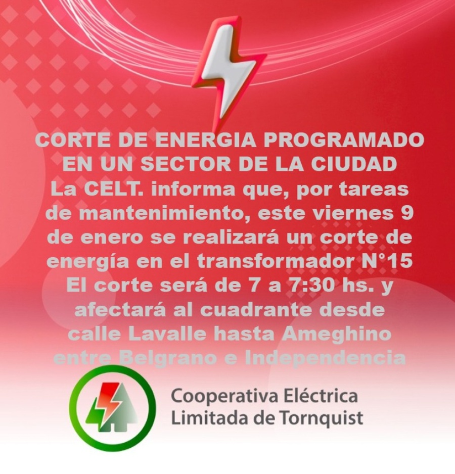 Corte programado de energía en un sector de la ciudad AYER 16:54:33 | 804 LECTURAS | GENERALES Informa CELT.