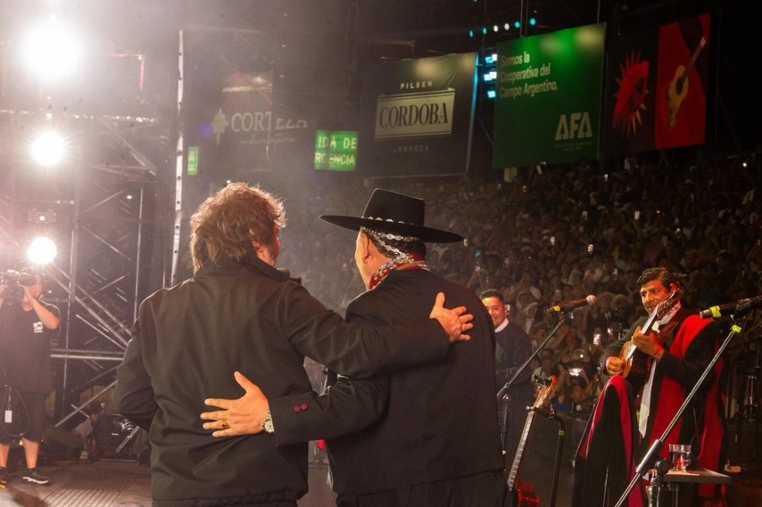 Ante la invitación de Palavecino para cantarlo a dúo, el Presidente intentó excusarse inicialmente alegando que "no le da el piné" y que él es un "amateur" al lado del folclorista. Sin embargo, tras la insistencia del músico —quien le recordó su pasado rockero y cantando temas de Leonardo Favio—, Milei subió al escenario.