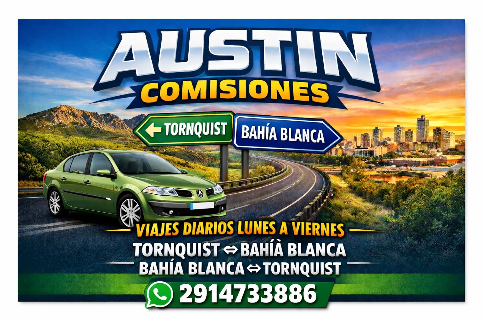 Un nuevo servicio de comisiones comenzará este martes 20 de enero- Tornquist-Bahia Blanca . Salida de nuestro vehículo a las 6 de la mañana y regreso a la hora 16.