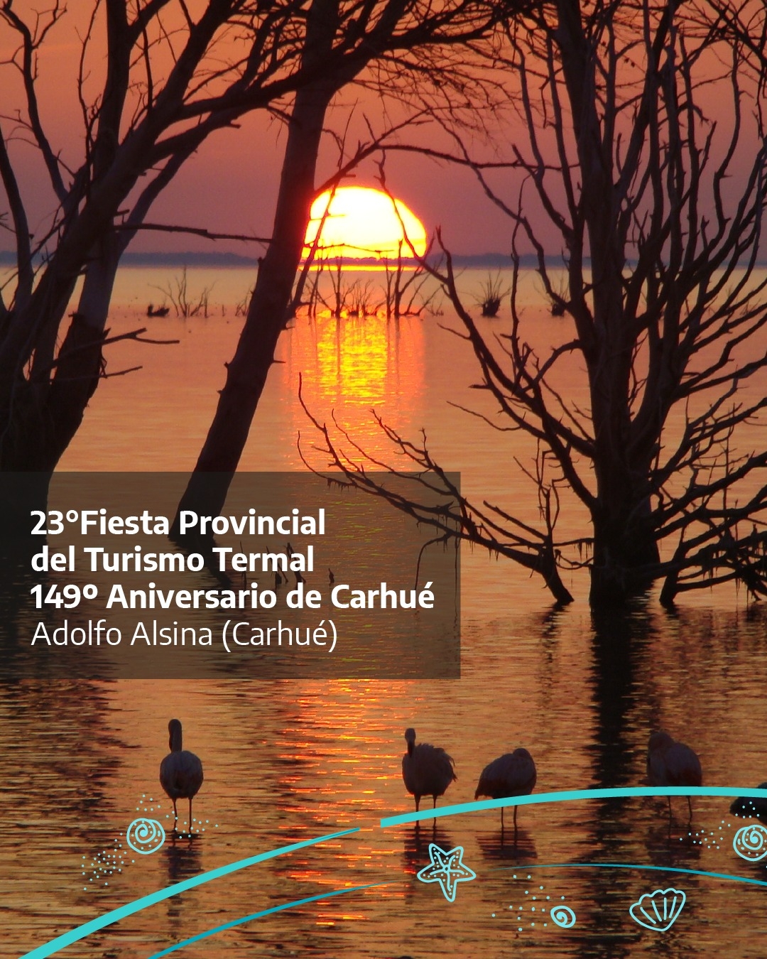 Descripción: Viernes, de 21:00 a 00:00, Noche de las Termas, con 50% de descuento en el ingreso al Complejo Termal Mar de Epecuén; a las 21:00, en la cortada de la plaza, bandas en vivo, bailódromo y la Kuky Band. Sábado, celebración del aniversario de Carhué y Fiesta del Turismo Termal: puestos gastronómicos de las instituciones, emprendimientos, artesanías y espectáculos musicales con Gadu, Lo Luiggi y cierre a cargo de Estelares. Domingo, Tardecita de Música en la playa Eco Sustentable con la actuación de Pau Herrera a las 20:00; a las 21:00, en la cortada de la plaza, bailódromo y la presentación de Rubén y sus teclados. Entrada gratuita. Organiza la Municipalidad de Adolfo Alsina con la participación de la Subsecretaría de Turismo del Ministerio de Producción, Ciencia e Innovación Tecnológica del Gobierno de la Provincia de Buenos Aires y el Consejo Federal de Inversiones.