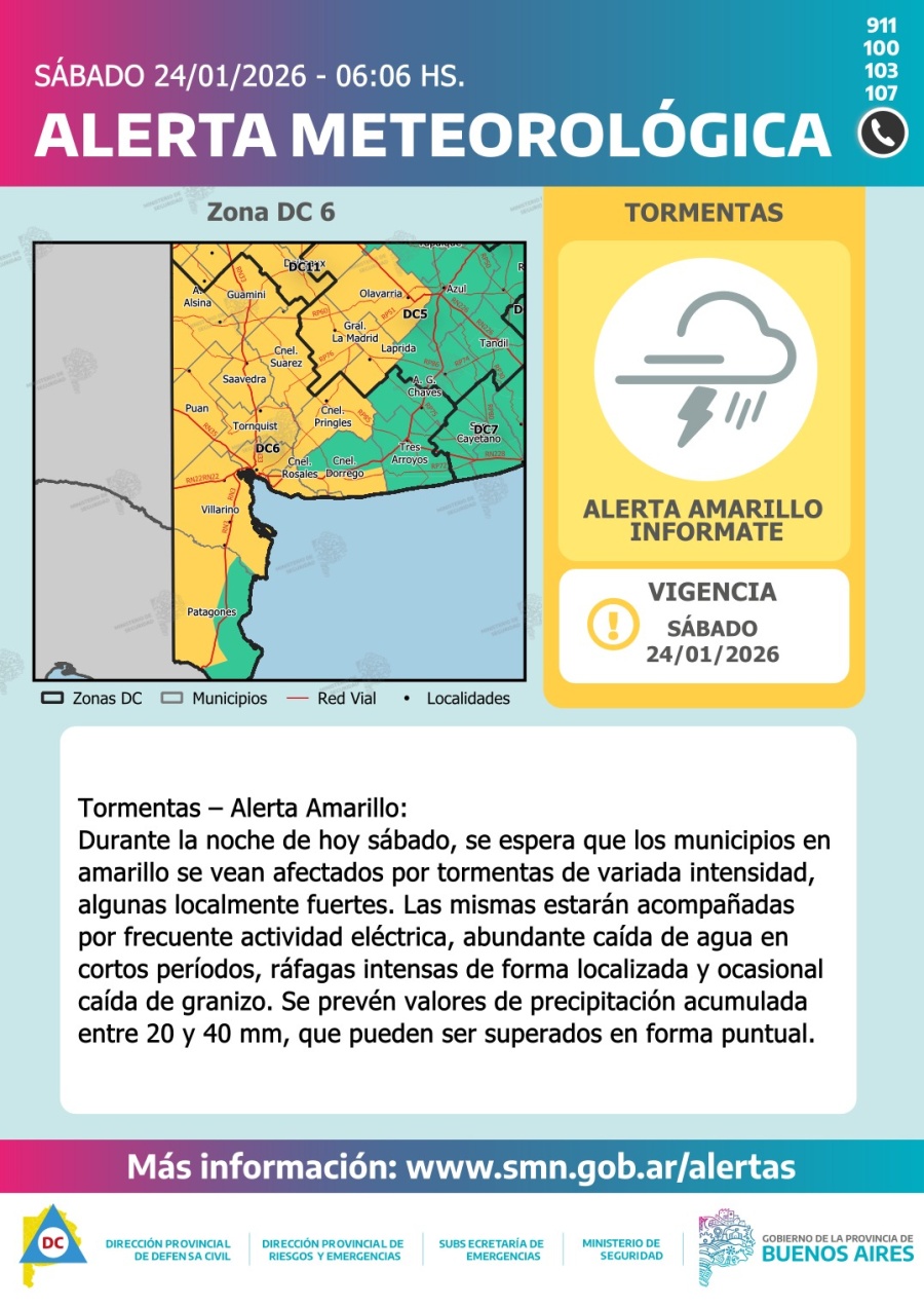 Hacia el final de la tarde y durante la noche de hoy sábado 24/1, se prevé un período de inestabilidad que generará lluvias y tormentas de variada intensidad sobre la franja oeste de la provincia. Algunas de estas tormentas podrían ser localmente fuertes, y estar acompañadas por frecuente actividad eléctrica, ráfagas intensas de forma localizada, ocasional caída de granizo y abundante caída de agua en cortos períodos.