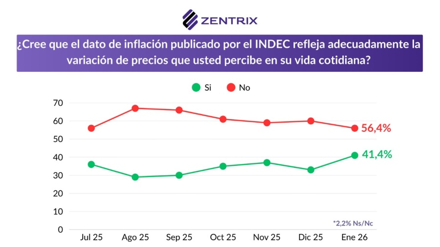 En el mismo sentido, el relevamiento muestra que la inflación también se discute en el plano de la credibilidad: el 56,4% de los encuestados no cree que el dato del INDEC refleje lo que se vive en la calle, mientras que el 41,4% sí considera que el índice oficial se acerca a su percepción cotidiana.