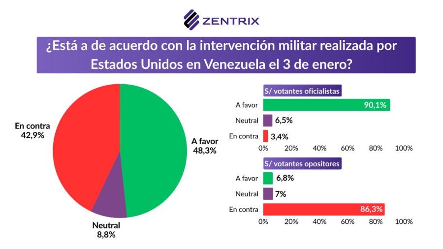Venezuela. En el MOP de enero, uno de los capítulos más llamativos fue el dedicado a Venezuela, donde la encuesta midió el clima social frente a la intervención de Estados Unidos y el posicionamiento que debería adoptar Argentina. Los resultados muestran un escenario partido en dos: el 48,3% se manifestó a favor de una intervención militar estadounidense en Venezuela, contra el 42,9% que se expresó en contra.