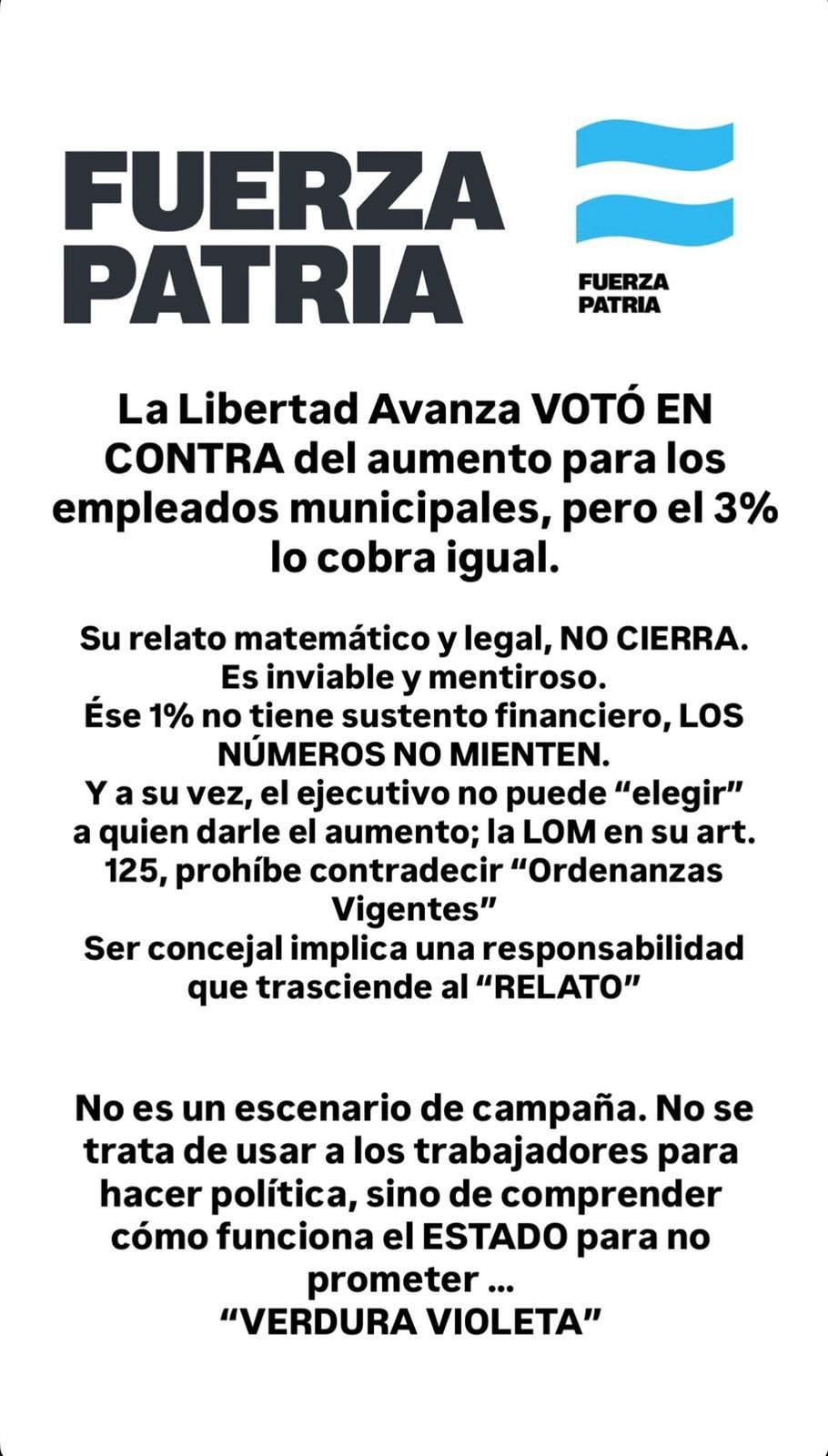 Desde Fuerza Patria desmentimos, con datos concretos y con respaldo legal, la propuesta presentada por los concejales de La Libertad Avanza, por tratarse de una iniciativa técnica y legalmente inviable.