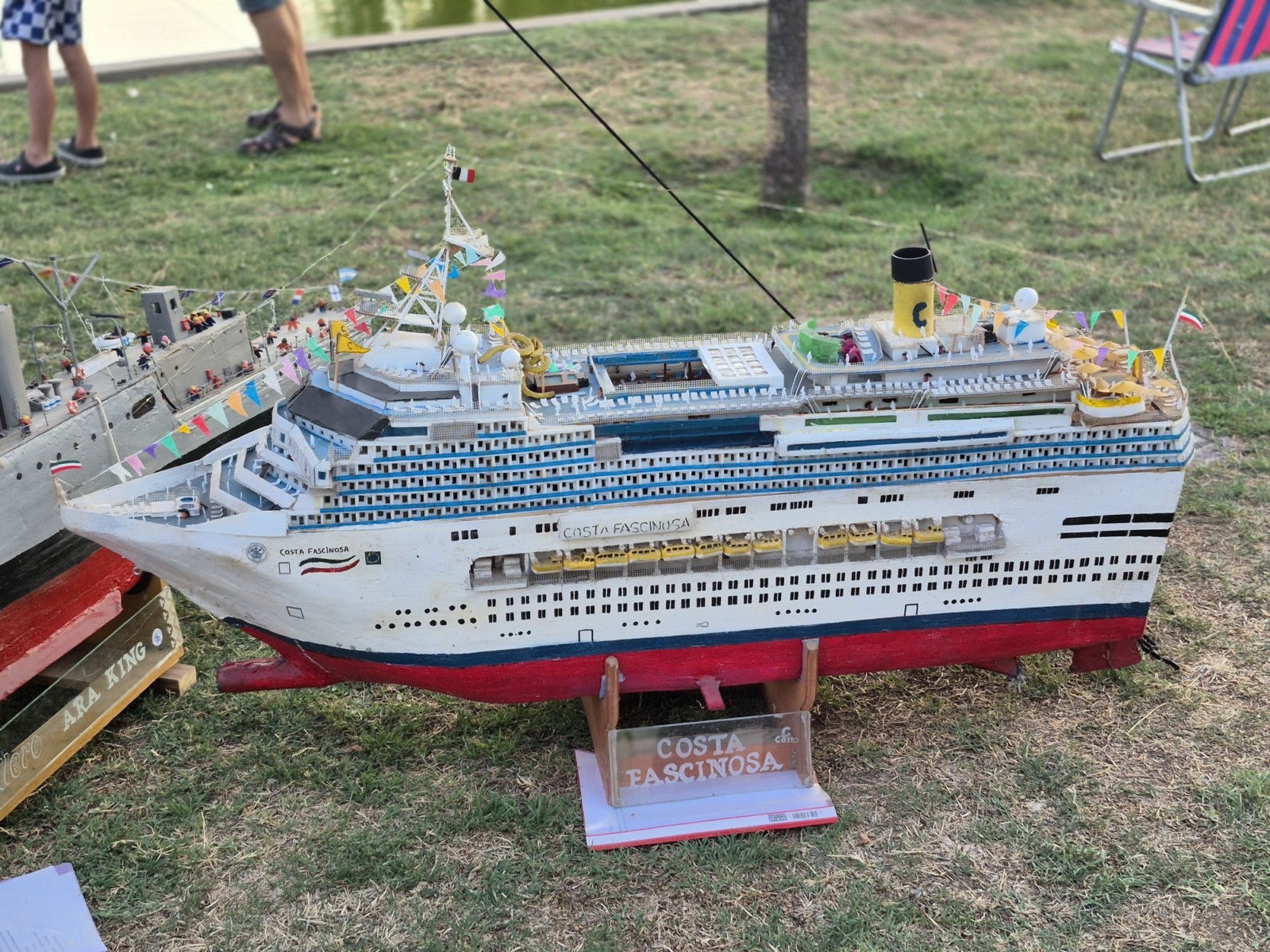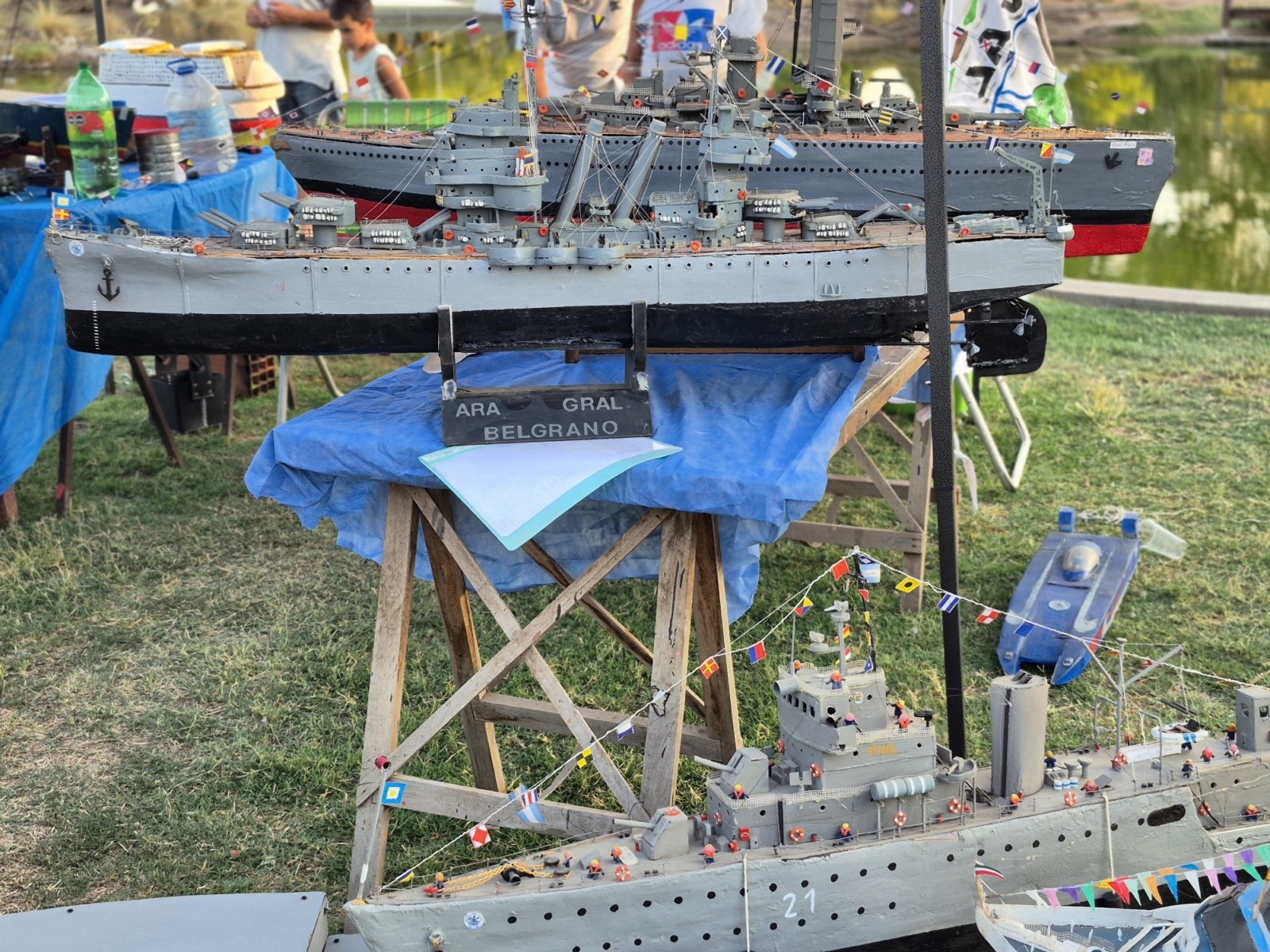 Cristian y Jano( su hijo) pusieron de manifiesto el trabajo de investigación histórica, los dotes que poseen de habilidad manual y precisión técnica, para tan impactantes obras, o maquetas , que ellos tan amablemente dispusieron para que nosotros los espectadores podamos deleitarnos con sus producciones navales, no sólo estáticas sino que las hicieron navegar por las aguas del lago de la plaza, y más aún sobre el atardecer para que se pudiera apreciar la obra en su totalidad, ya que contaban con iluminación.