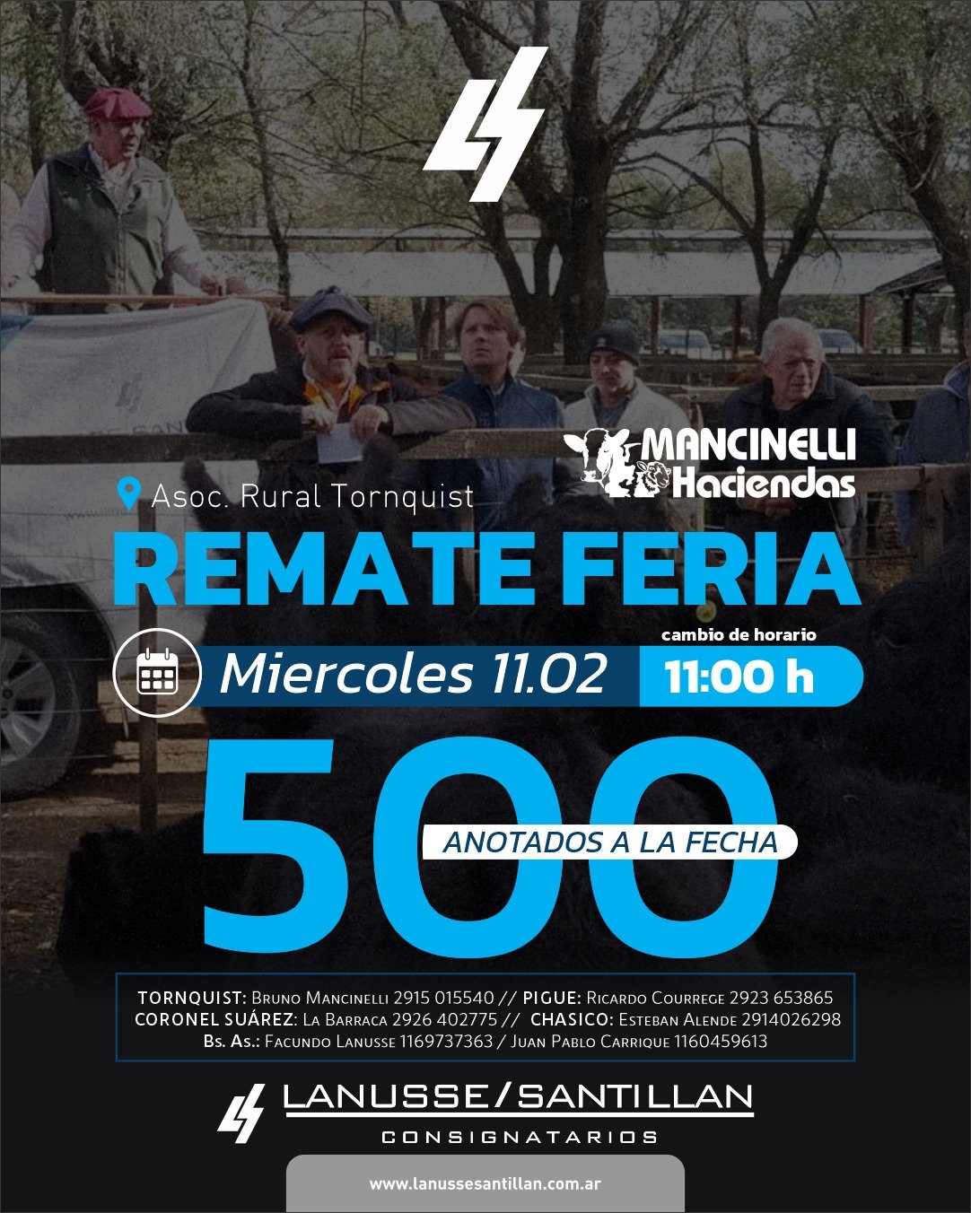 Remate de Mancinelli haciendas HOY 10:24:43 | 117 LECTURAS | GENERALES Programado para el 11 de febrero.