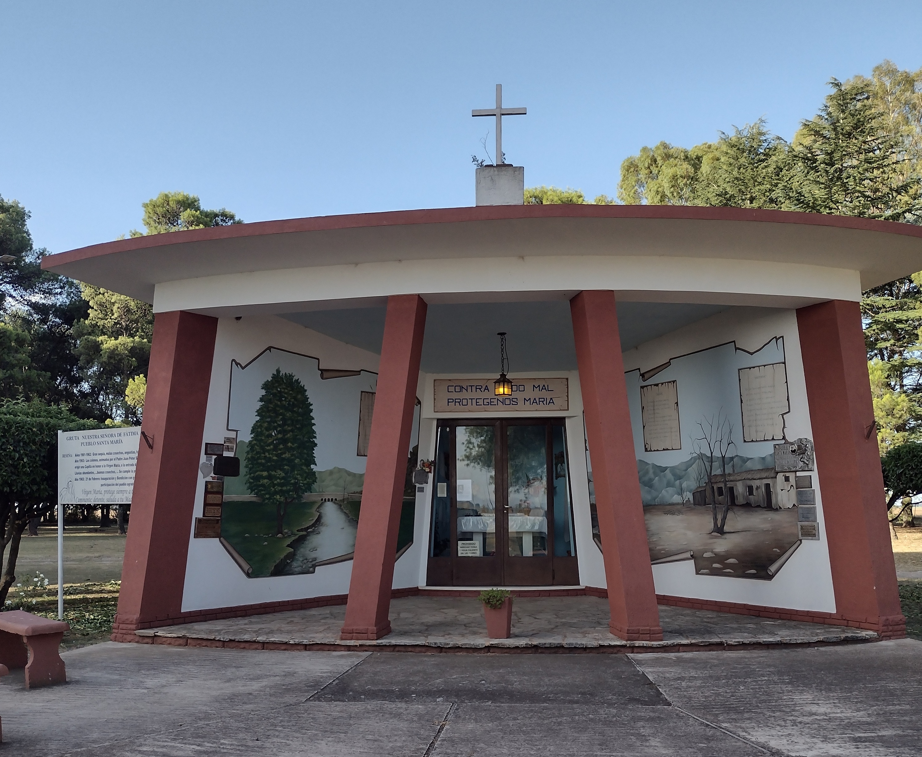 El sacerdote Juan Peter junto con la colaboración desinteresada de muchas personas, concretaron la obra en muy poco tiempo: Pedro Pin donó 2 hectáreas de campo, Mateo Hippener diseñó la gruta, el albañil Pedro Schmidt la construyó, el artista plástico Salvador Schneider pintó los murales a ambos laterales y Pedro Cumler tuvo a su cargo el riego y cuidado de la plantación de árboles con que se embelleció el lugar.
