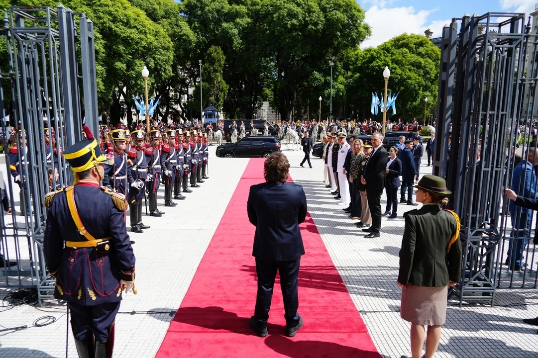 Tras arribar en el auto oficial, participó el saludo de rigor a a cargo del Regimiento de Granaderos, siguió con la entonación del Himno Nacional y terminó con la ofrenda. Todo en un lapso de solo 14 minutos.