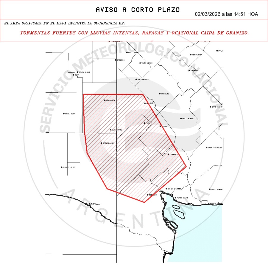 El distrito de Tornquist se encuentra bajo un Aviso a Corto Plazo (ACP) por tormentas fuertes, según la información emitida este 2 de marzo a las 14:51 horas. El alerta tiene una validez de una hora desde su emisión y abarca también a los partidos bonaerenses de Adolfo Alsina, Bahía Blanca, Puan y Villarino, además de sectores de la provincia de La Pampa.