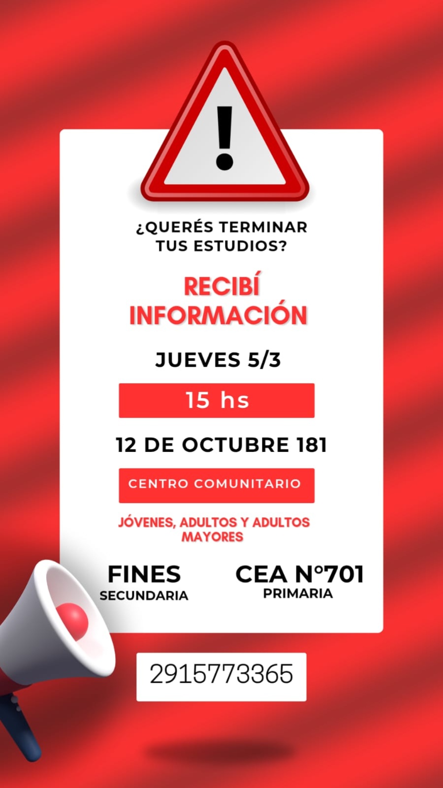 Se brindará información sobre el Plan FinEs (secundaria) y el CEA Nº701 (primaria) para jóvenes y adultos.