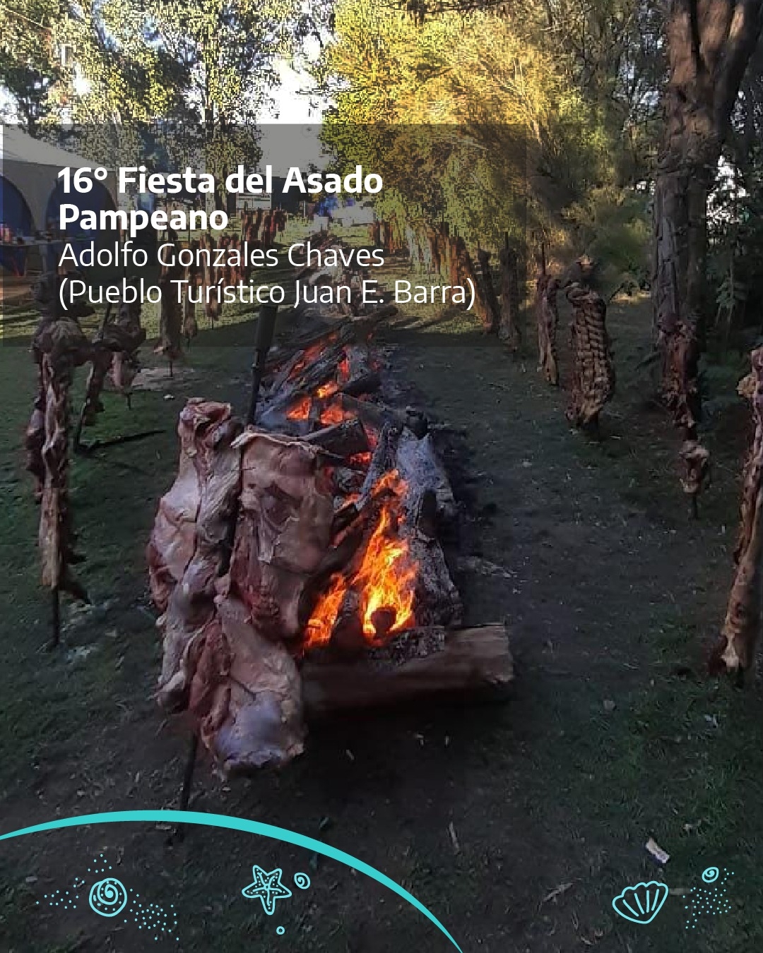 Descripción: Sábado, baile familiar; domingo, concurso de asadores, espectáculos musicales con la presentación del grupo Amaneceres, Francisco "Pancho" Santaren y Emiliano "Pampita" Pellegrino. Cierre con Nico Mattioli. Entrada: bono contribución de $3.000. En el marco del 117 aniversario de Juan E. Barra. Organiza la Comisión de Festejos Asado Pampeano, la Municipalidad de Adolfo Gonzales Chaves y la participación de la Subsecretaría de Turismo del Ministerio de Producción, Ciencia e Innovación Tecnológica del Gobierno de la Provincia de Buenos Aires. Juan E. Barra forma parte del programa Pueblos Turísticos de la Subsecretaría de Turismo de PBA.
