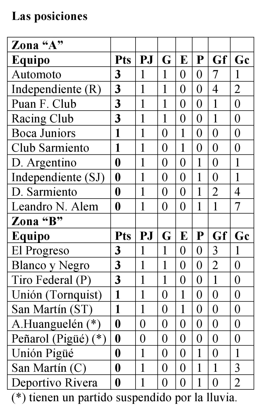 El "rojo" debutó con contundente 7-1 frente a Alemn de Coronel Pringles y el "verde" igualó 0-0 en su visita a San Martín de Santa Trinidad.