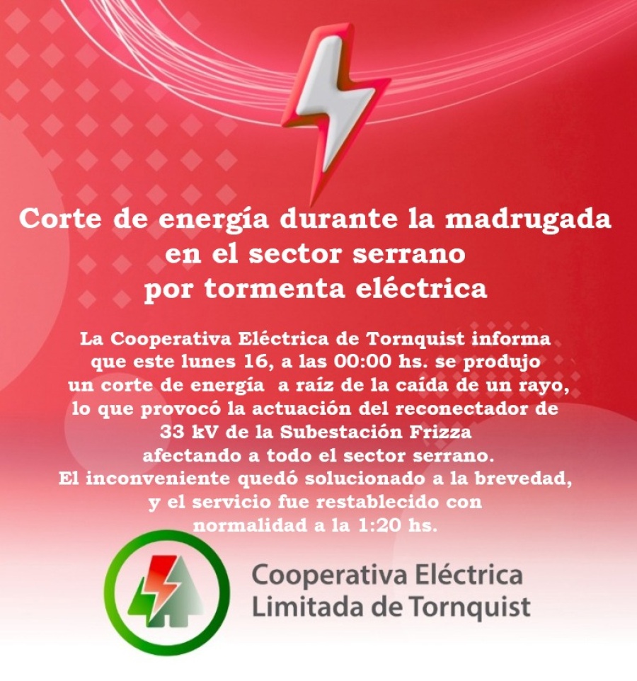 Corte de energía en el sector serrano por tormenta eléctrica HOY 12:17:04 | 223 LECTURAS | GENERALES Informa la CELT.