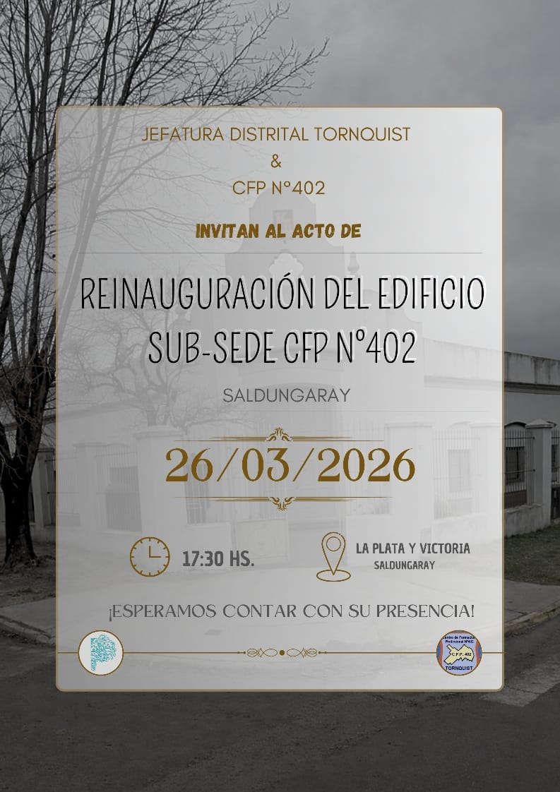 Esta Jefatura Distrital remite Invitación al Acto de Reinauguración de la Subsede Saldungaray del CFP N° 402. El mismo se llevará a cabo el día 26 de marzo a las 17:30hs en La Plata y Victoria, Saldungaray.