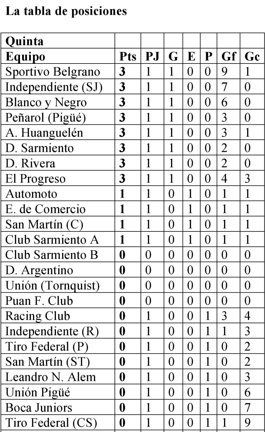 Quinta: Atlético Huanguelén 3 vs. Independiente de Rivera 1; Deportivo Rivera 2 vs. San Martín de Santa Trinidad 0; Sportivo Belgrano 9 vs. Tiro Federal de Coronel Suárez 1; Unión Pigüé 0 vs. Blanco y Negro 6; Boca Juniors 0 vs. Independiente de San José 7; Club Sarmiento “Azul” 1 vs. San Martín de Carhué 1; Deportivo Sarmiento “Rojo” 2 vs. Tiro Federal de Puan 0; Leandro N. Alem de Coronel Pringles 0 vs. Peñarol de Pigüé 3; Empleados de Comercio 1 vs. Automoto 1 (Pacher) y El Progreso 4 vs. Racing Club 3. Libres: Club Sarmiento “Blanco”, Deportivo Argentino, Unión de Tornquist y Puan F. Club.