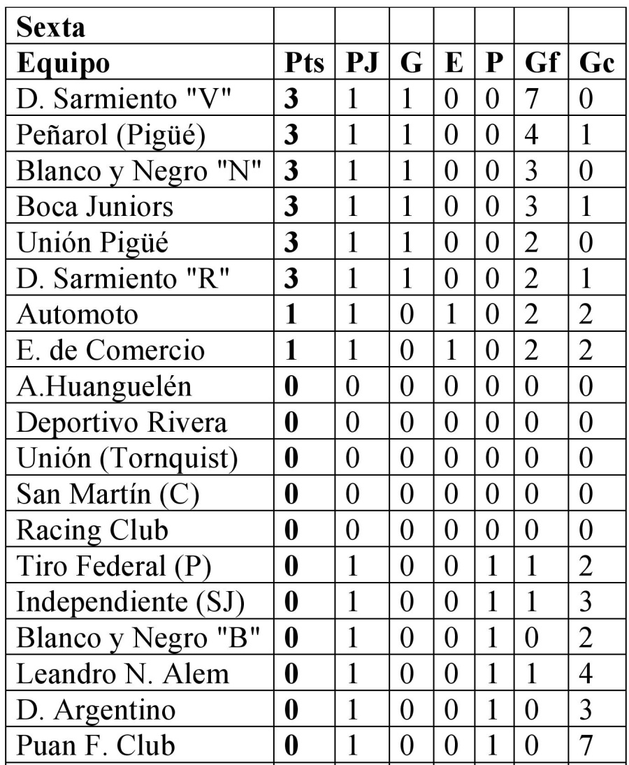 Sexta: Blanco y Negro “Negro” 3 vs. Deportivo Argentino 0; Unión Pigüé 2 vs. Blanco y Negro “Blanco” 0; Boca Juniors 3 vs. Independiente de San José 1; Deportivo Sarmiento “Rojo” 2 vs. Tiro Federal de Puan 1; Leandro N. Alem de Coronel Pringles 1 vs. Peñarol de Pigüé 4; Empleados de Comercio 2 vs. Automoto 2 (Cartuccia y Medina) y Puan F. Club 0 vs. Deportivo Sarmiento “Verde” 7. Libres: Atlético Huanguelén, Deportivo Rivera, Unión de Tornquist, San Martín de Carhué y Racing Club.