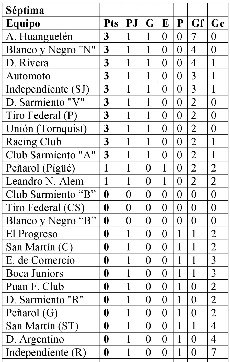 Séptima: Atlético Huanguelén 7 vs. Independiente de Rivera 0; Blanco y Negro “Negro” 0 vs. Deportivo Argentino 4; Deportivo Rivera 4 vs. San Martín de Santa Trinidad 1; Boca Juniors 1 vs. Independiente de San José 3; Unión de Tornquist 2 (Goldestein y Parra) vs. Peñarol de Guaminí 0; Club Sarmiento “Azul” 2 vs. San Martín de Carhué 1; Deportivo Sarmiento “Rojo” 1 vs. Tiro Federal de Puan 2; Leandro N. Alem de Coronel Pringles 2 vs. Peñarol de Pigüé 2; Empleados de Comercio 1 vs. Automoto 3 (Martínez, Rossi y García); El Progreso 1 vs. Racing Club 2 y Puan F. Club 0 vs. Deportivo Sarmiento “Verde” 2. Libres: Club Sarmiento “Blanco”, Tiro Federal de Coronel Suárez y Blanco y Negro “Blanco”.